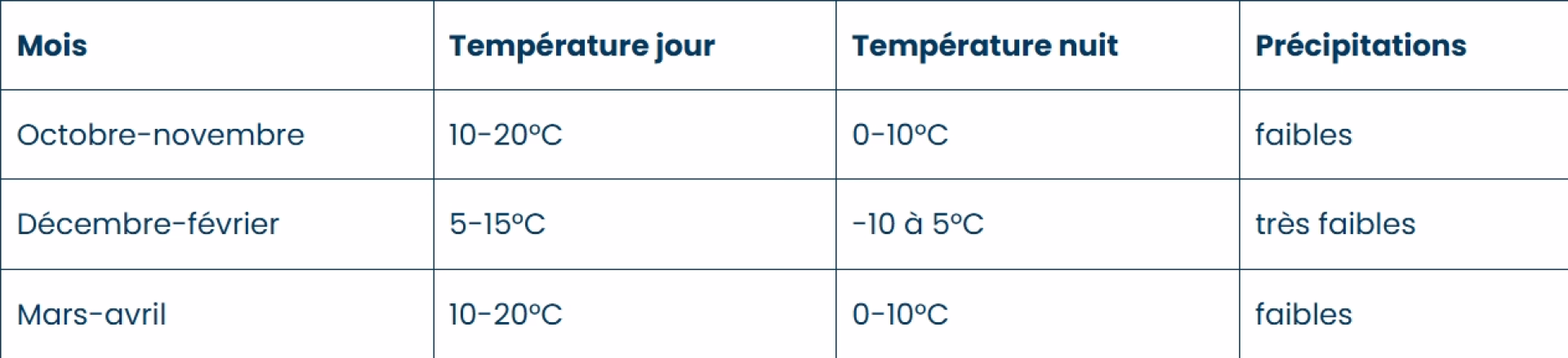 Et côté climat et météo ? Inutile d’emporter ta panoplie polaire complète, ni de redouter l’apocalypse. La région bénéficie d’une saison sèche idéale d’octobre à avril, offrant des journées claires et limpides. Le soir, les températures descendent mais restent gérables même pour ceux qui n’aiment pas grelotter.