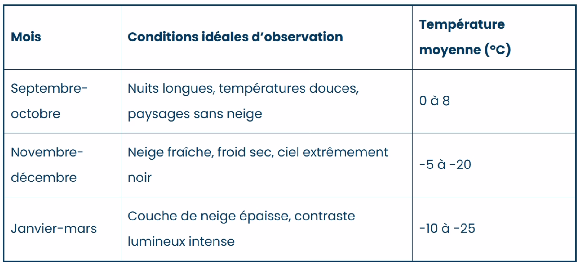 Si tu veux mon avis, jouer les chasseurs d’aurores, c’est un peu comme préparer un soufflé : il faut être précis avec le timing. Pour profiter pleinement du spectacle, la meilleure saison s’étend de septembre à mars. Voilà la recette gagnante pour obtenir de longues nuits bien noires : l’obscurité tombe tôt, la neige réfléchit la lumière, ce qui sublime encore plus les traînées lumineuses.