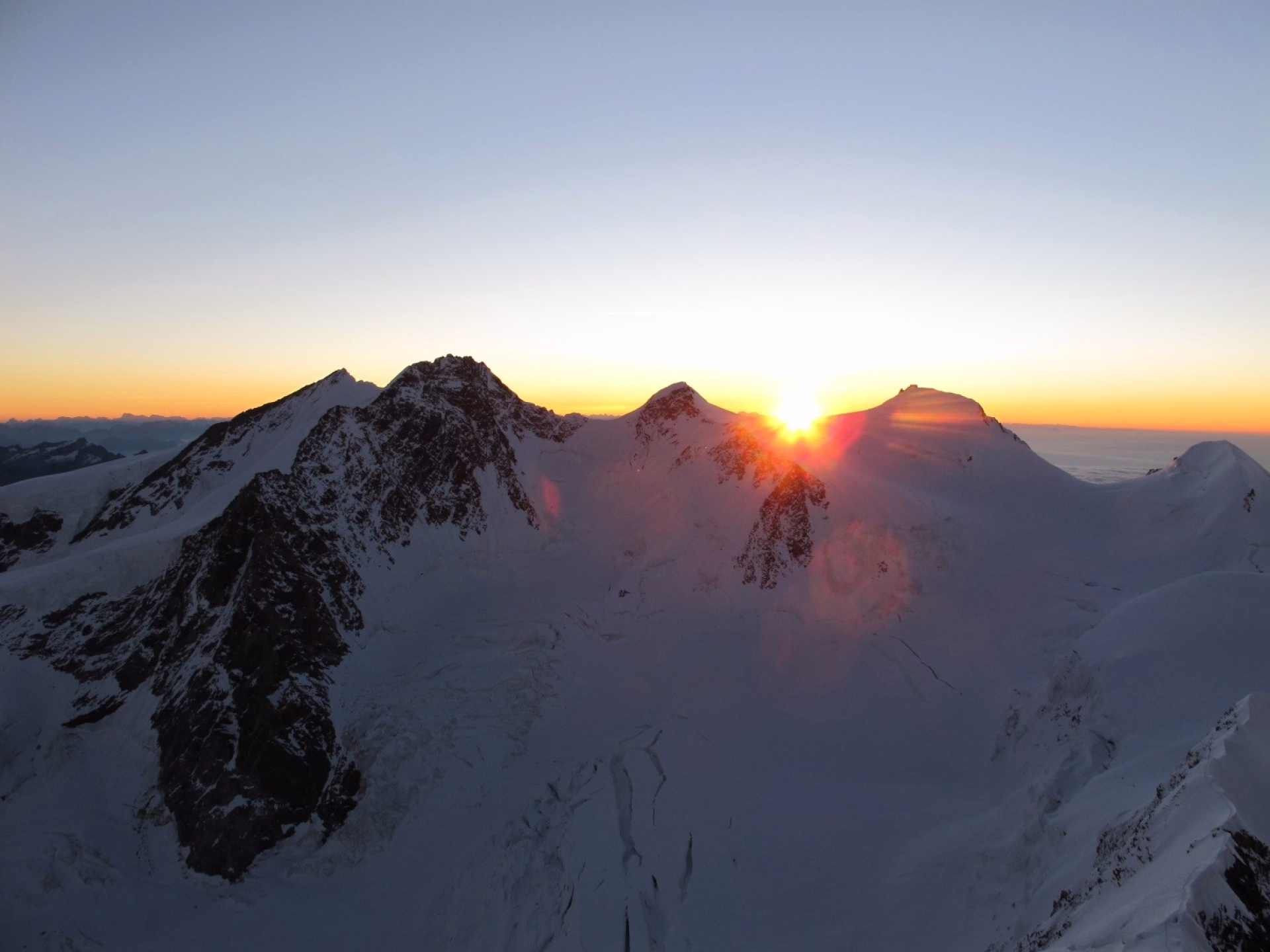 Rien ne vaut le spectacle du lever du jour sur le glacier, lorsque la lumière caresse déjà la crête sommitale. Le moment où la pointe Dufour apparaît, effleurée par les rayons dorés, procure une véritable émotion. Chaque crevasse franchie, chaque sommet atteint construit un récit de persévérance et d’épanouissement.
