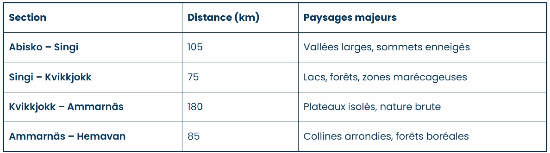Le sentier relie deux points emblématiques : Abisko, porte d’entrée vers le grand nord, et Hemavan au sud, chacun offrant une ambiance particulière. Les étapes, variant de douze à vingt-cinq kilomètres, mettent la diversité des reliefs à portée de tous, que l'on choisisse l’itinéraire complet ou seulement quelques tronçons.