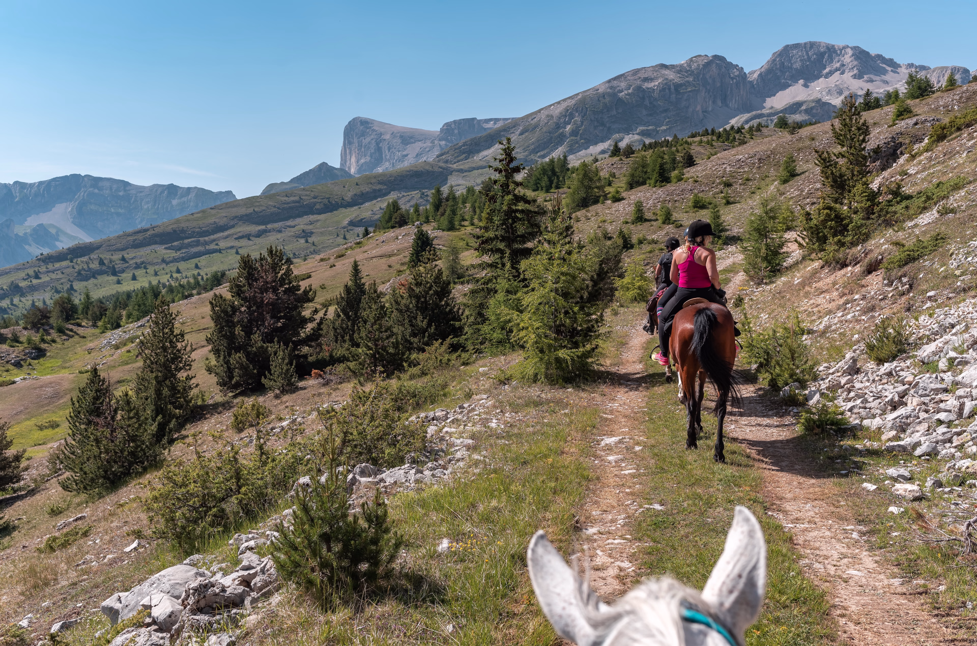 Randonnée équestre en été sur les sentiers paisibles du Dévoluy.