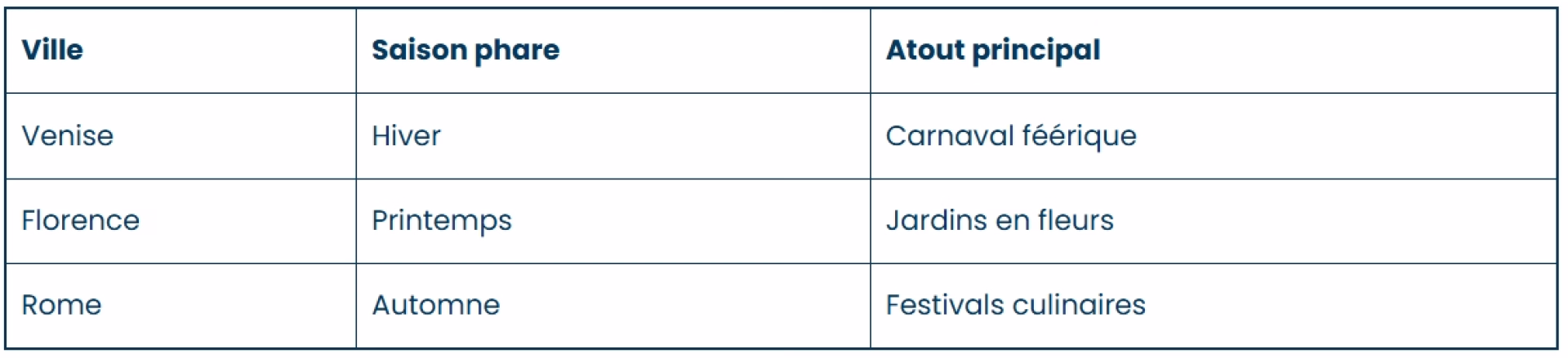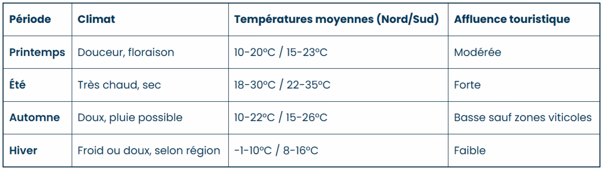 Ce tableau simplifie la comparaison générale du climat et de l’affluence touristique durant une année typique en Italie :