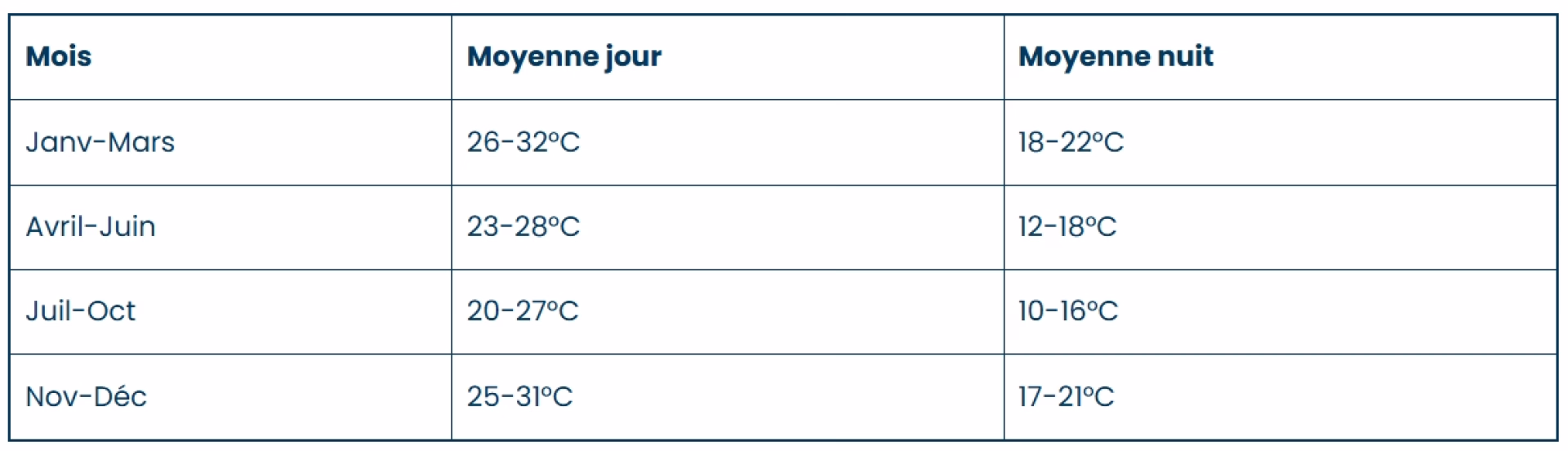 - Novembre-décembre : Retour à la petite saison des pluies, mais climat encore agréable, surtout début décembre.