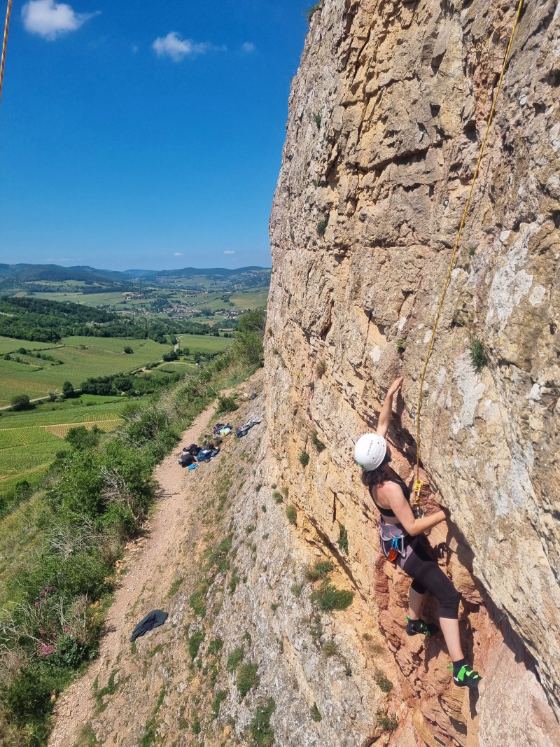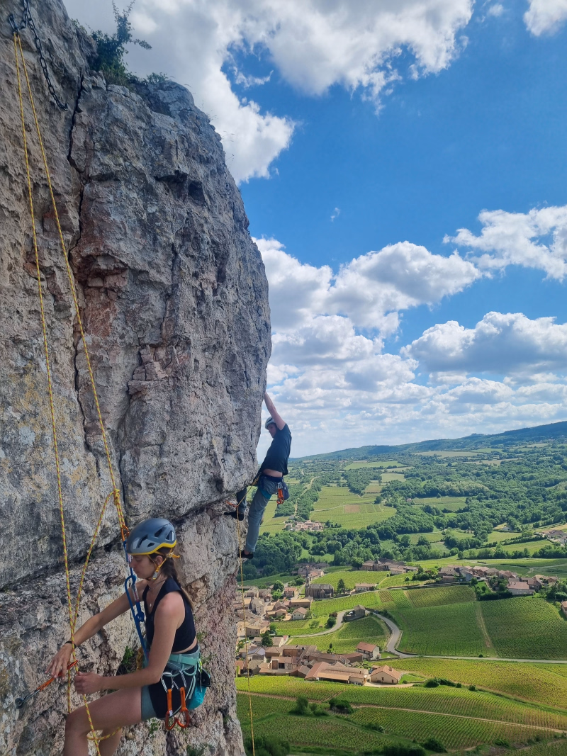 Imaginez trois jours où chaque coup de pédale devient une invitation à explorer. Depuis la gare de Mâcon, vous enfourchez votre vélo et partez à travers les vignes, les collines et les villages pittoresques de Bourgogne. À la fin de chaque étape, ce sont des falaises majestueuses qui vous accueillent : Vergisson & Solutré. Ces roches, Sculptées par des millénaires de vent et de lumière, offrent un rocher calcaire parfait pour grimper dans un cadre naturel exceptionnel. Ici, l’escalade n’est pas seulement une performance ; c’est une expérience conviviale, où l’on apprend, rit, partage et progresse ensemble. Vous grimpez, vous descendez, vous repartez à vélo, et vous traversez les paysages comme on tourne les pages d’un livre vivant — une aventure authentique, accessible quel que soit votre niveau, et profondément ancrée dans la nature. Ce séjour de 3 jours est bien plus qu’un stage d’escalade : c’est une parenthèse où voyage et verticalité se rencontrent, où chaque instant est une découverte, et où l’on revient chez soi plus léger, fier de ses progrès, et riche de souvenirs inoubliables.