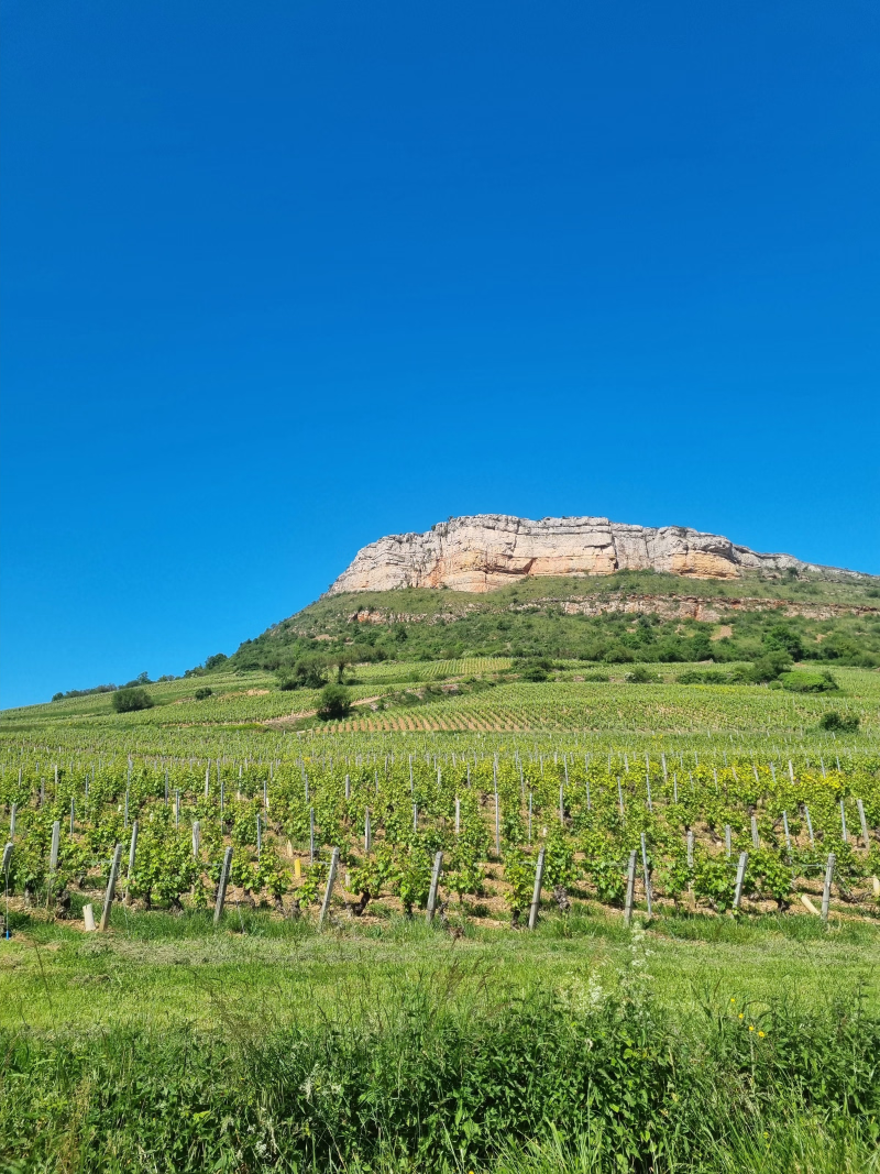 Nous prenons ensuite la route à vélo à travers les vignes et paysages bourguignons pour rejoindre la falaise de Solutré.