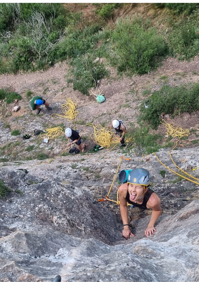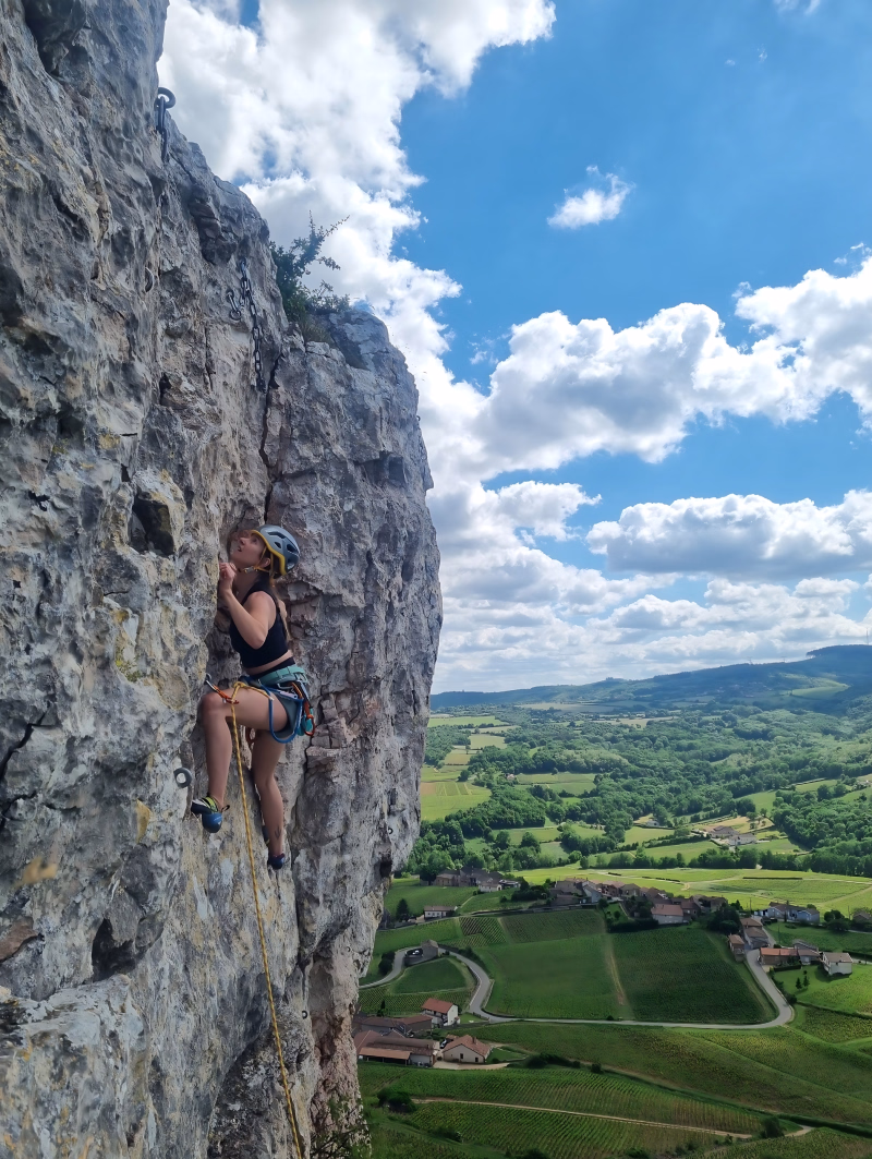 Sur place, première session d’escalade en milieu naturel : découverte du rocher, sensations, progression en douceur, le tout dans une ambiance conviviale.