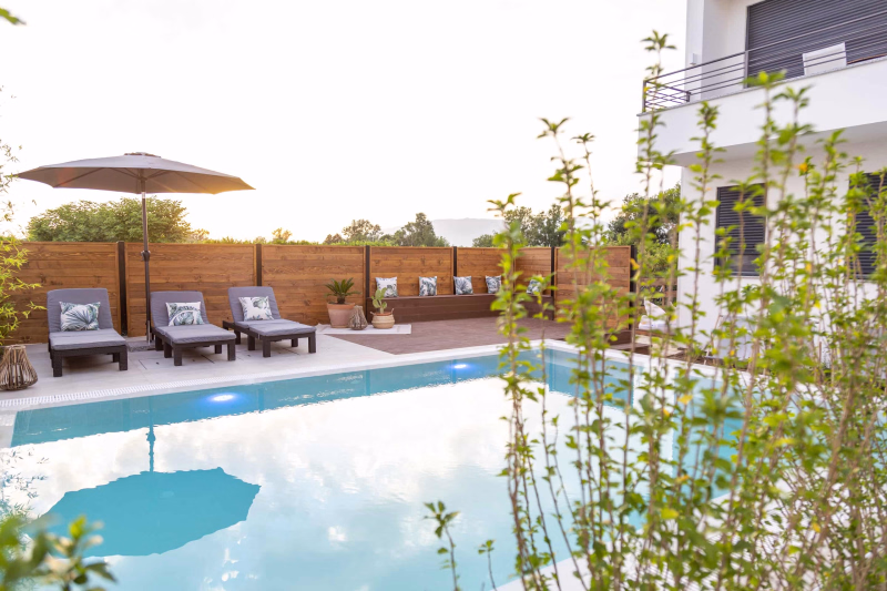 - Espace piscine avec bains de soleil, zone de détente et parasols