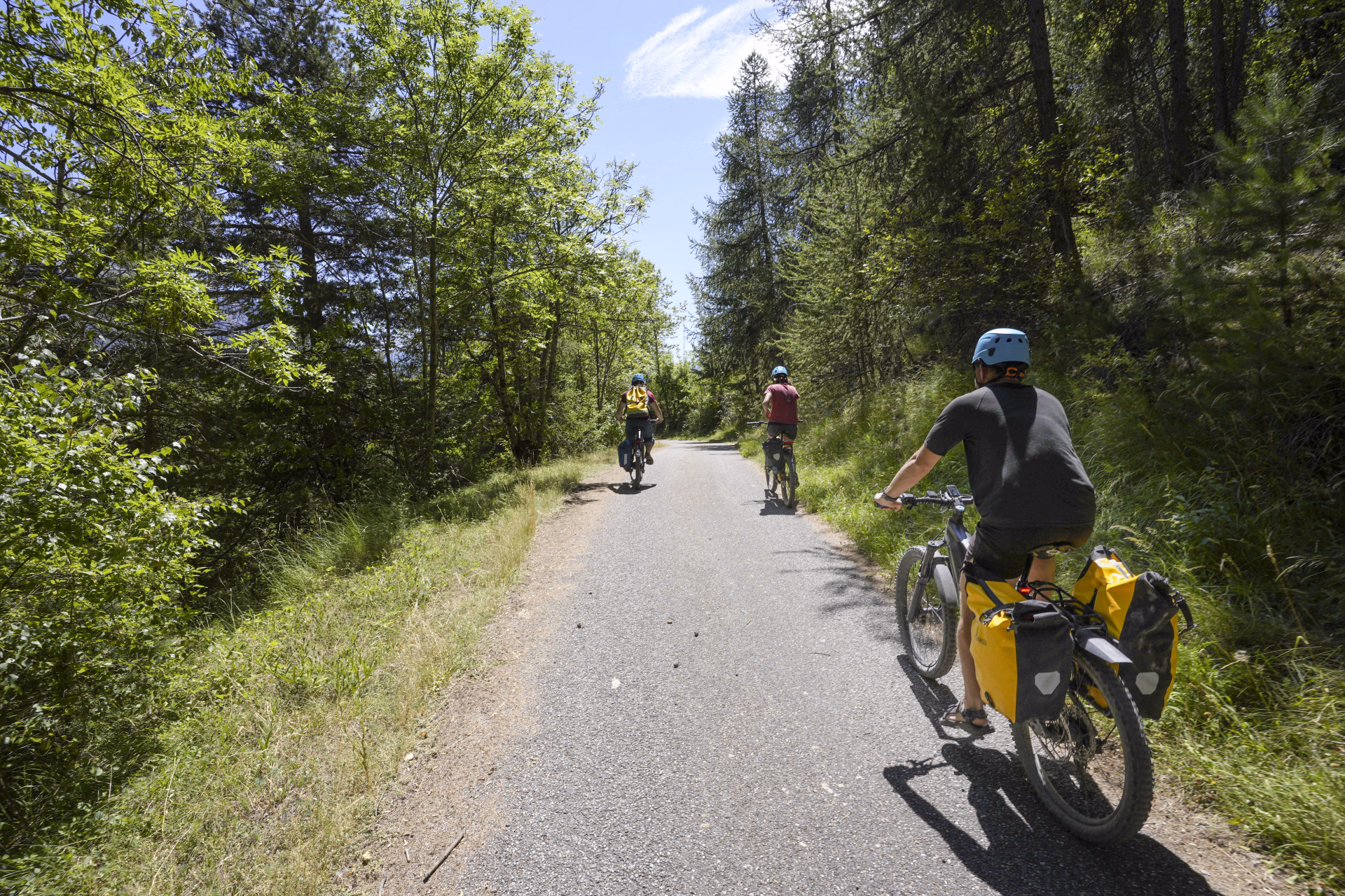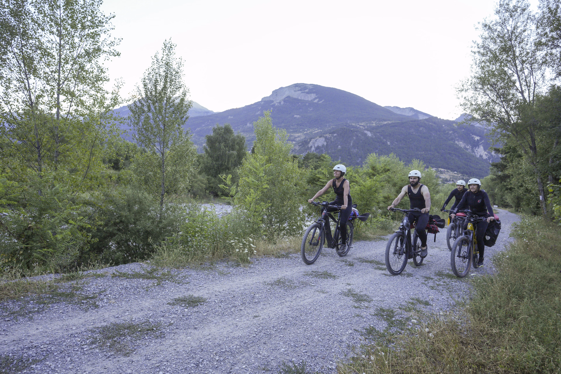 À la confluence avec le Guil, nous débarquons pour transférer sur les vélos. Les bateaux sont repliés, glissés dans les sacoches, et nous entamons une remontée douce à vélo en direction des gorges du Guil, à travers une vallée spectaculaire.