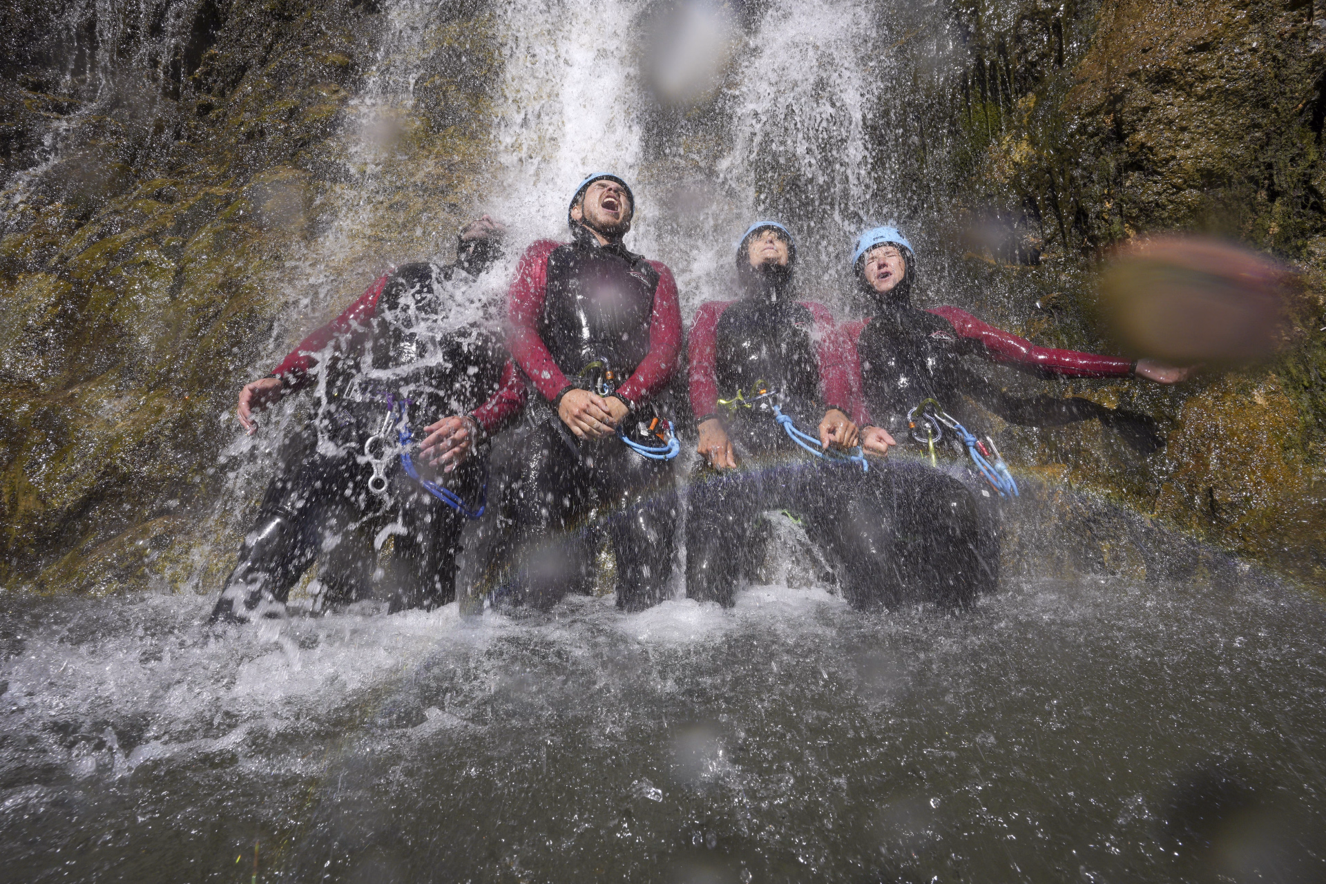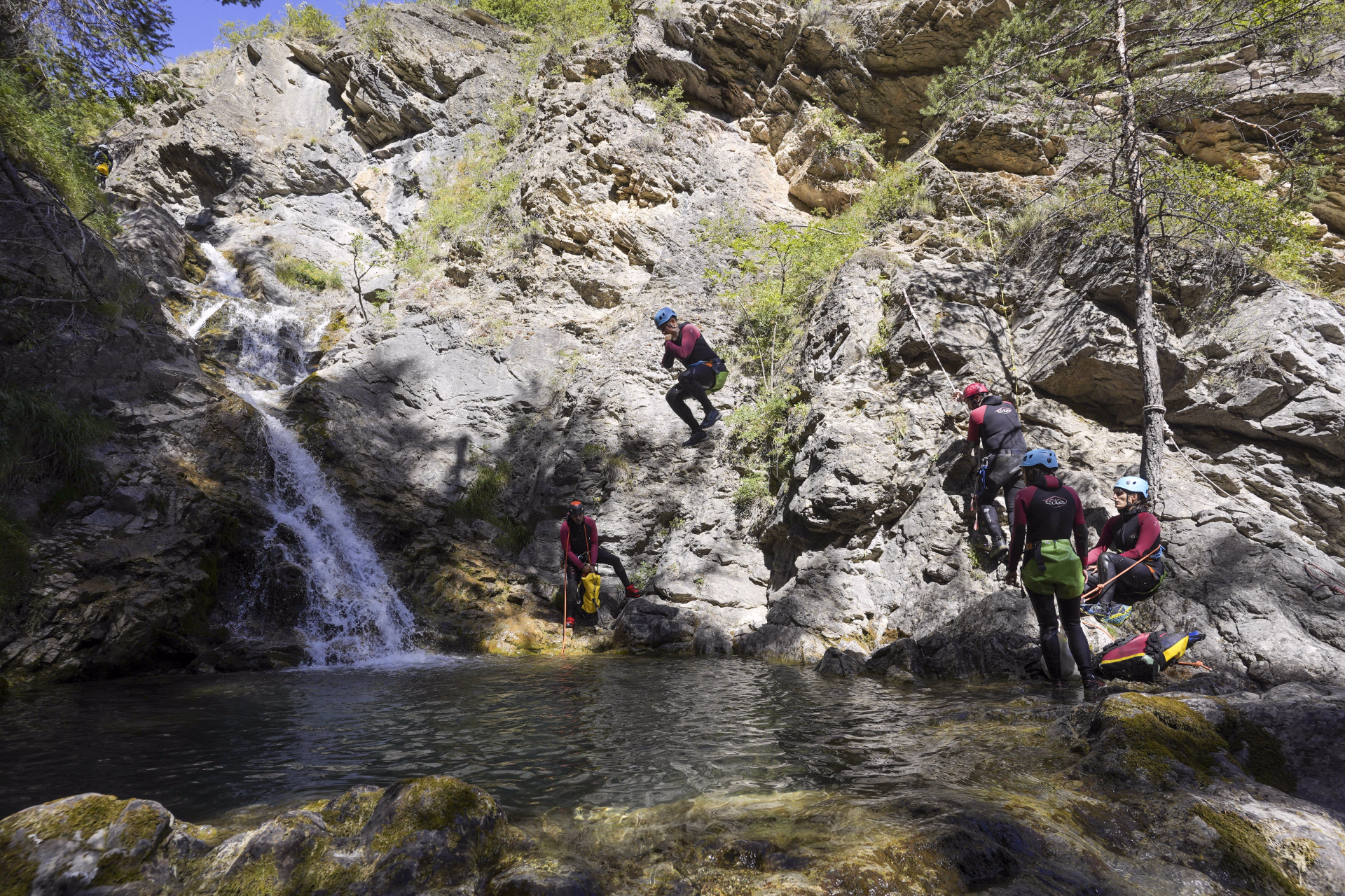 C’est là que débute une aventure canyoning accessible et ludique : toboggans naturels, petits sauts (facultatifs), descentes en rappel, dans une gorge minérale aux eaux limpides.