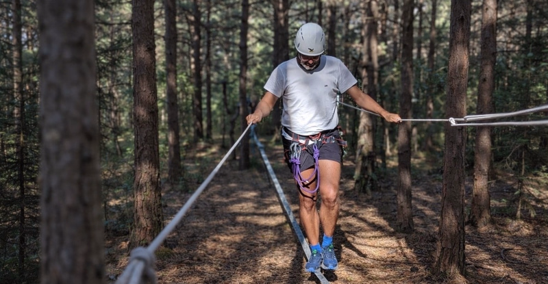 L’après-midi, à l’ombre des pins du refuge, enfilez un baudrier pour grimper dans les arbres et vous mettre au défi. Qui osera s’élancer le premier ?