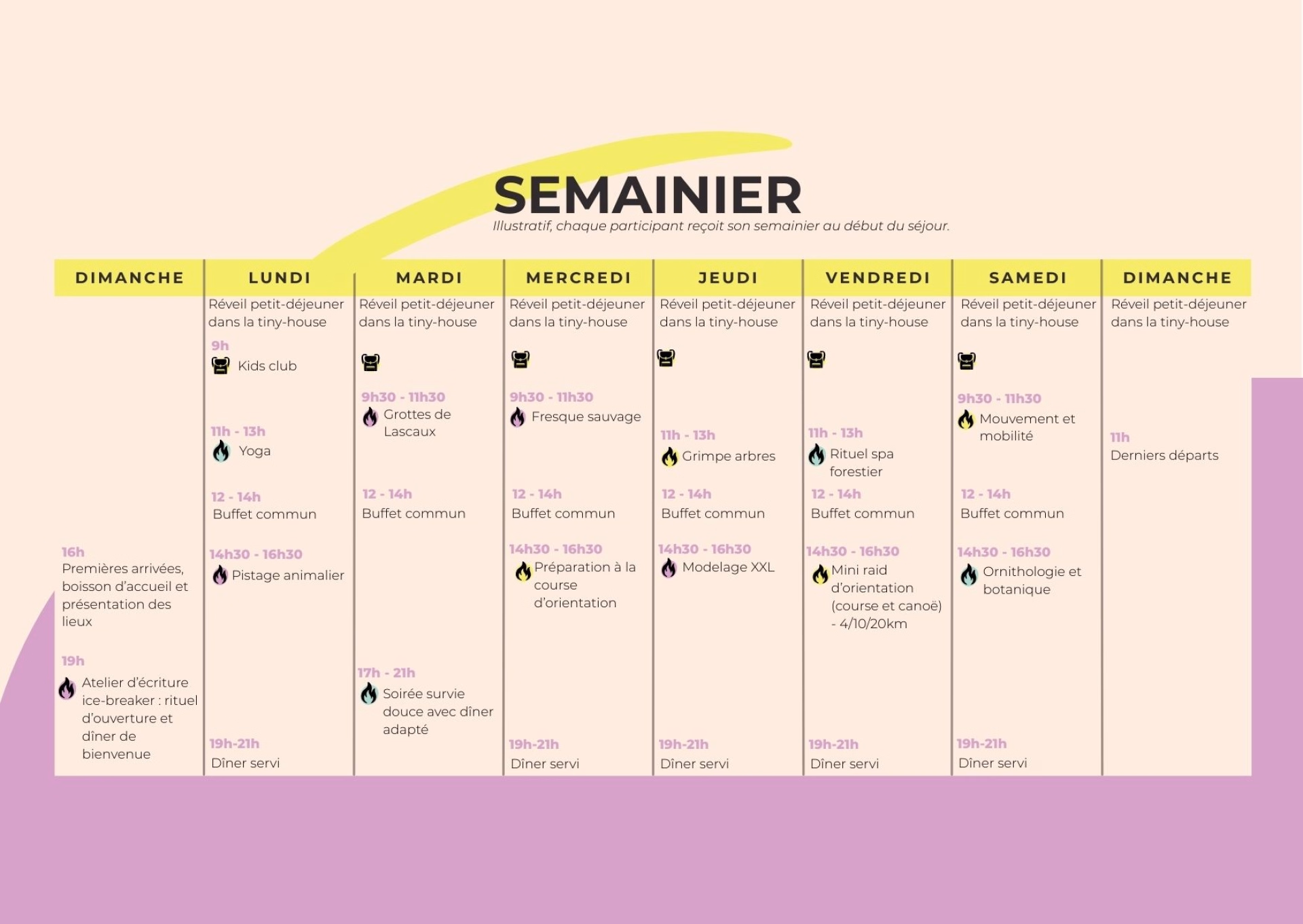 - Chaque participant reçoit son semainier au début du séjour