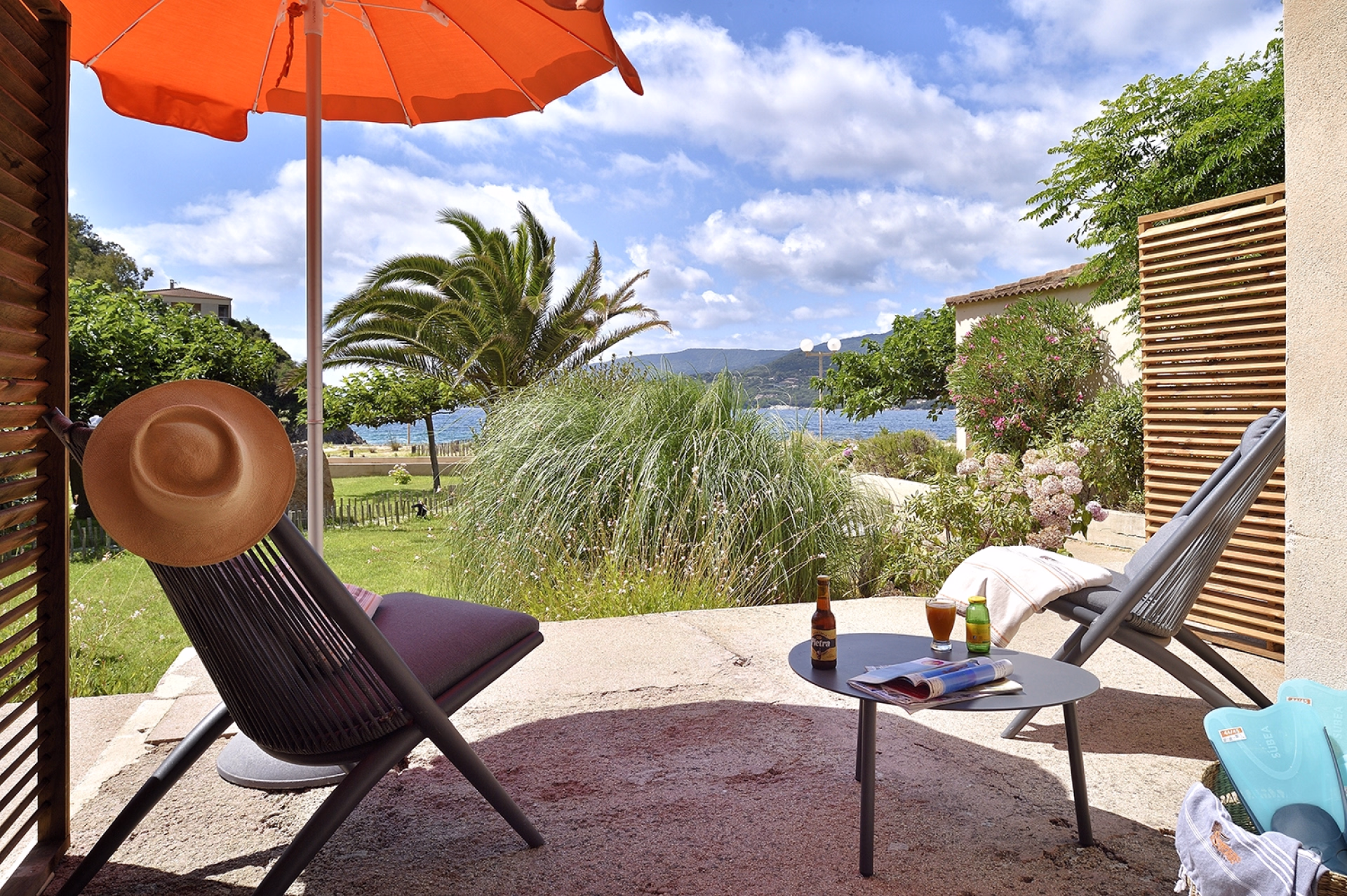 - Chambre confort (28 m²) : vue mer, de 1 à 4 couchages, climatisée avec une terrasse individuelle avec vue sur mer. Composée d’une pièce principale avec un lit King Size, d’une pièce séparée avec lits superposés et d’une salle d’eau avec douche à l’italienne.