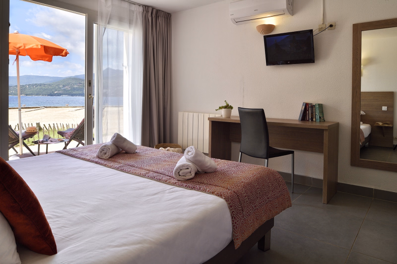 - Chambre premium (30 m²) : vue mer, de 1 à 4 couchages, climatisée avec terrasse vue mer. Composée d’une chambre avec lit double, d’une chambre séparée avec lits superposés et d’une salle d’eau avec douche à l’italienne.