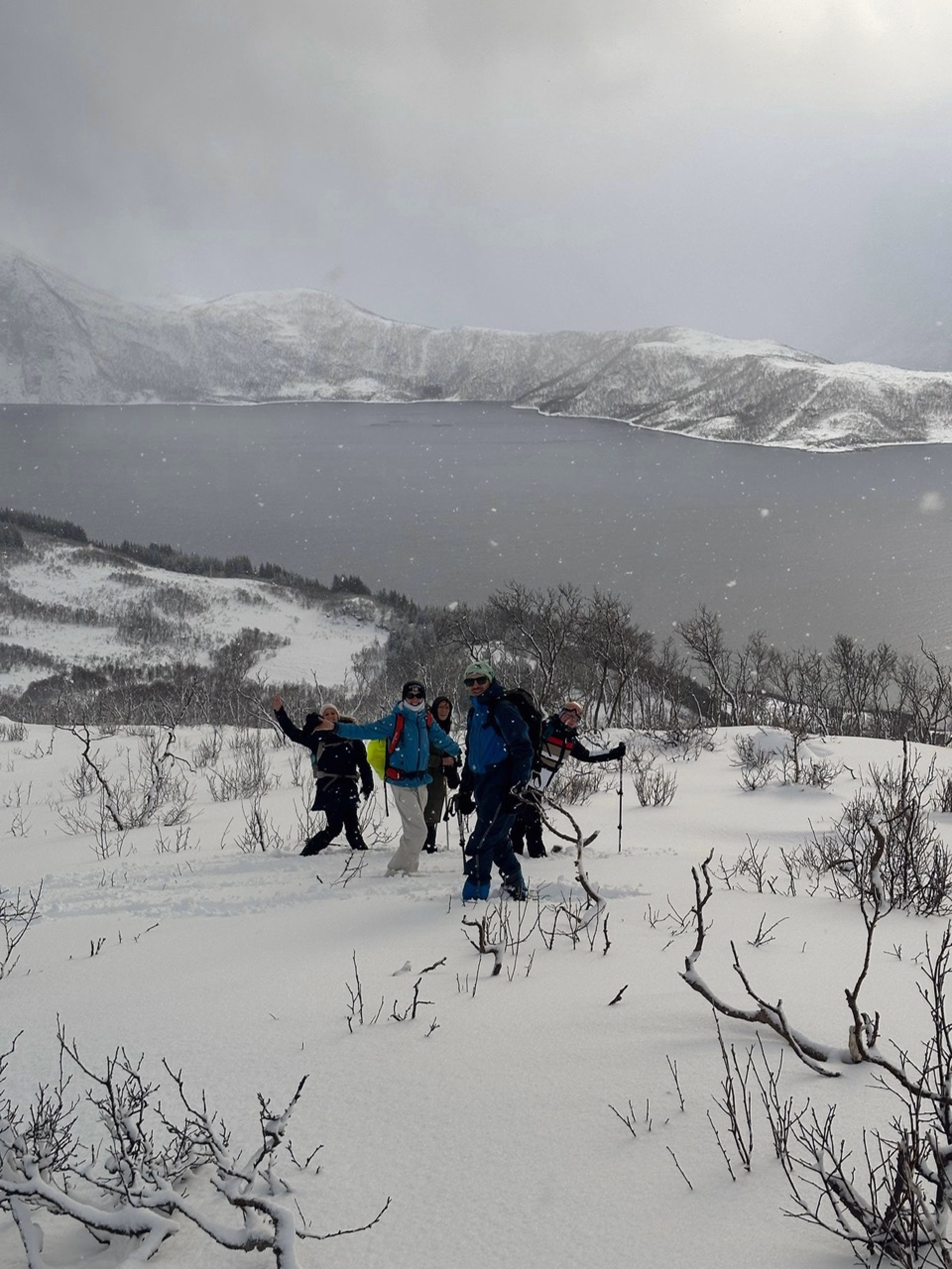 Au fil de notre progression, la vue se dégage sur des panoramas grandioses : au sud, l’île de Berg se dessine dans le décor hivernal, tandis que vers le nord, les pics acérés d’Okshornan, souvent appelés les "dents du diable", se dressent au-dessus des eaux de l’Ersfjorden. En contrebas, le Steinsfjorden, profond et paisible, complète ce tableau d’une beauté saisissante.