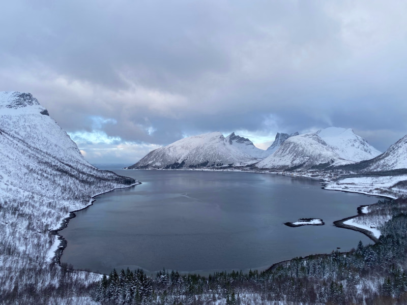 Ce point de vue privilégié offre une belle perspective de la région : en contrebas, les fjords scintillent, tandis qu’en face, le Segla surgit dans toute sa verticalité, découpant le ciel d’hiver dans un contraste saisissant.