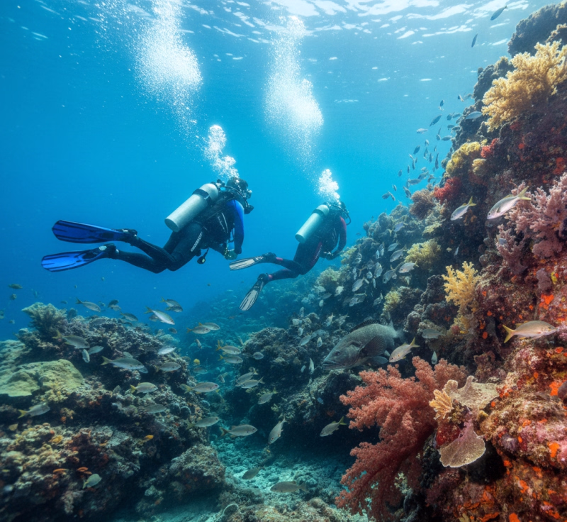 - Le matériel nécessaire pour les activités (combinaisons en néoprène, palmes, masques et tubas)