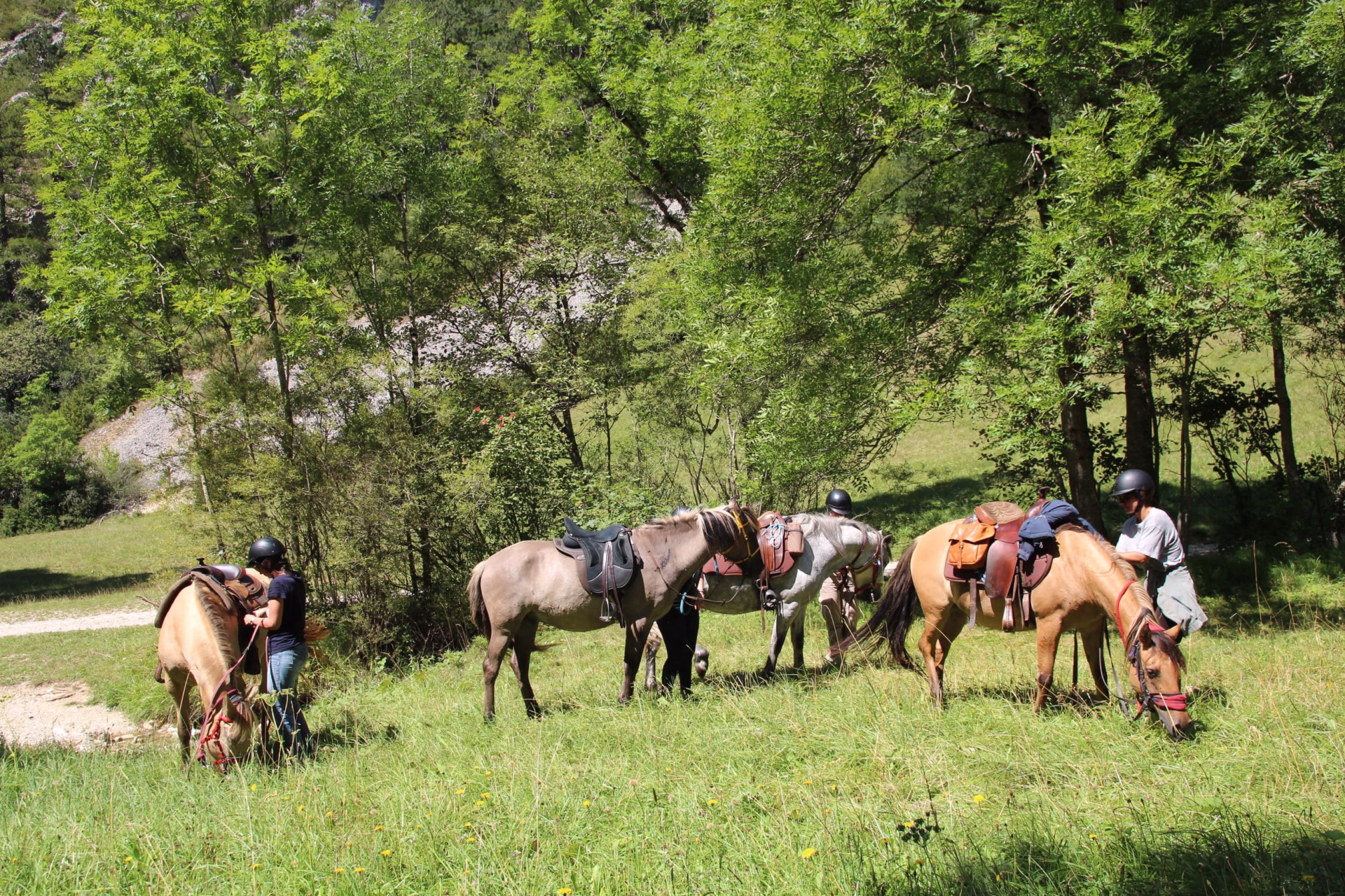 L’arrivée se fait en bord de rivière, où les chevaux sont laissés au parc pour un repos bien mérité.