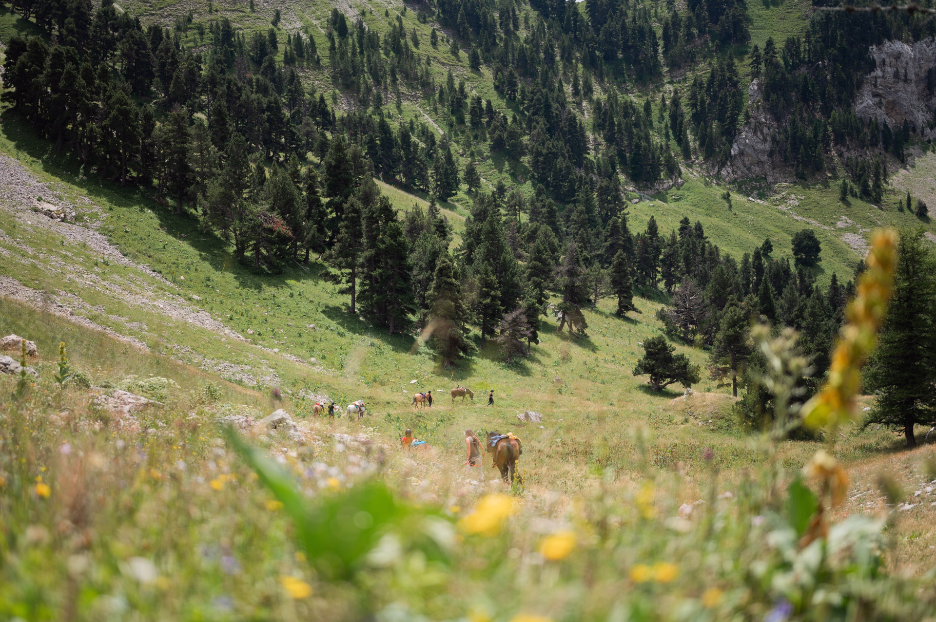 Entre 9h et 9h30, départ pour la randonnée, précédé d’un rapide briefing sur l’équitation de montagne. Vous empruntez d’abord une forêt de mélèzes, avant de gagner les alpages du Dévoluy. Là-haut, la vue sur le massif est saisissante.