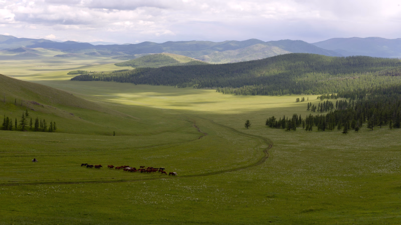 Nous poursuivons notre chevauchée à travers les vastes prairies de la vallée de l’Orkhon, véritable terre de nomadisme. Tout au long de la journée, des troupeaux de yacks, moutons, chèvres et chevaux évoluent librement autour de nous, offrant un tableau vivant et authentique de la Mongolie rurale.