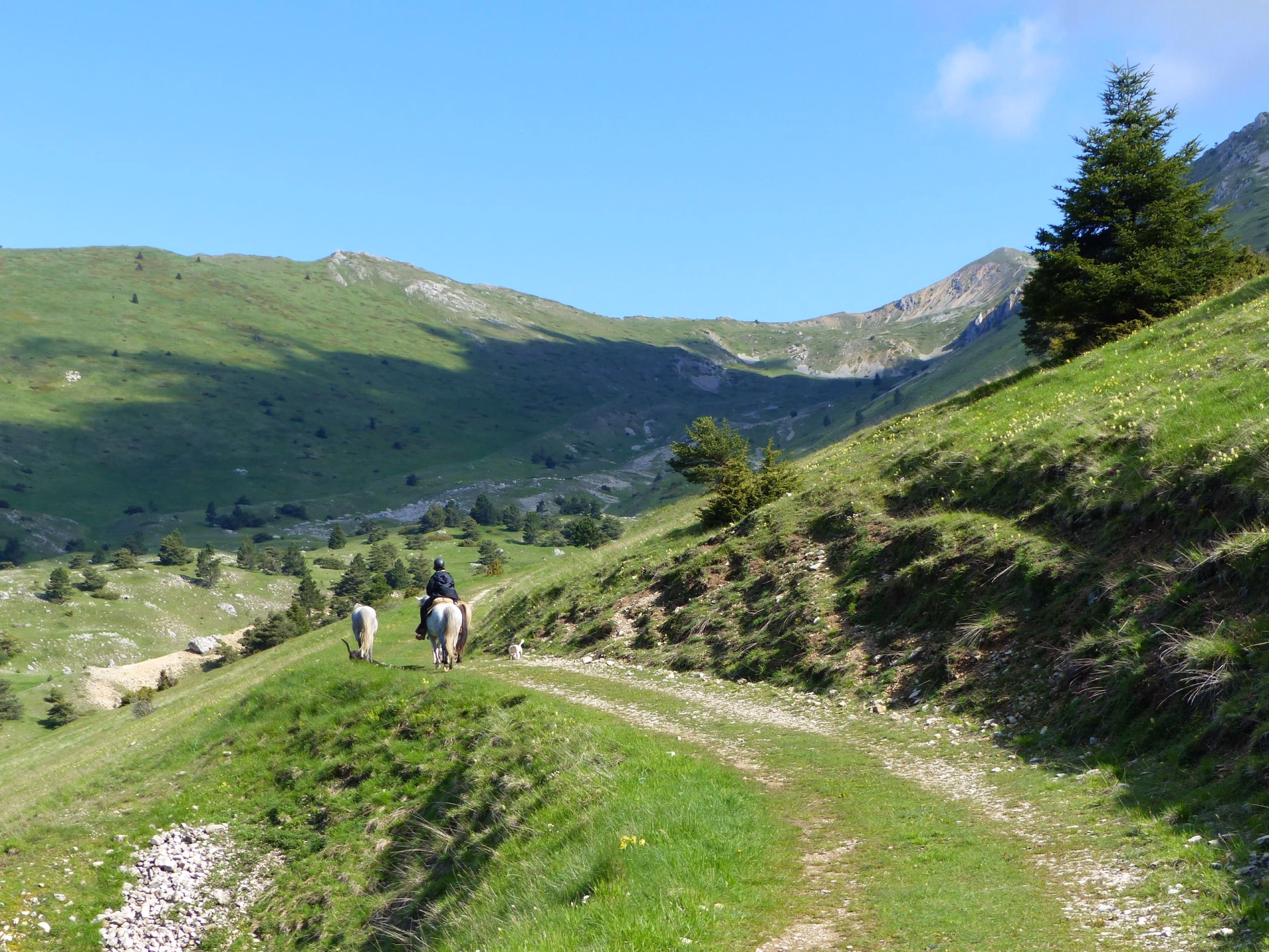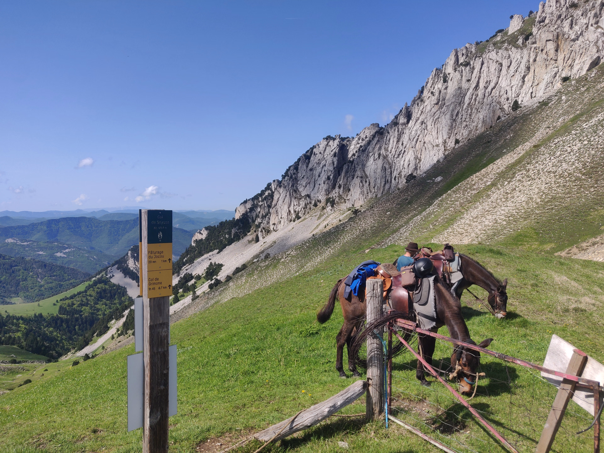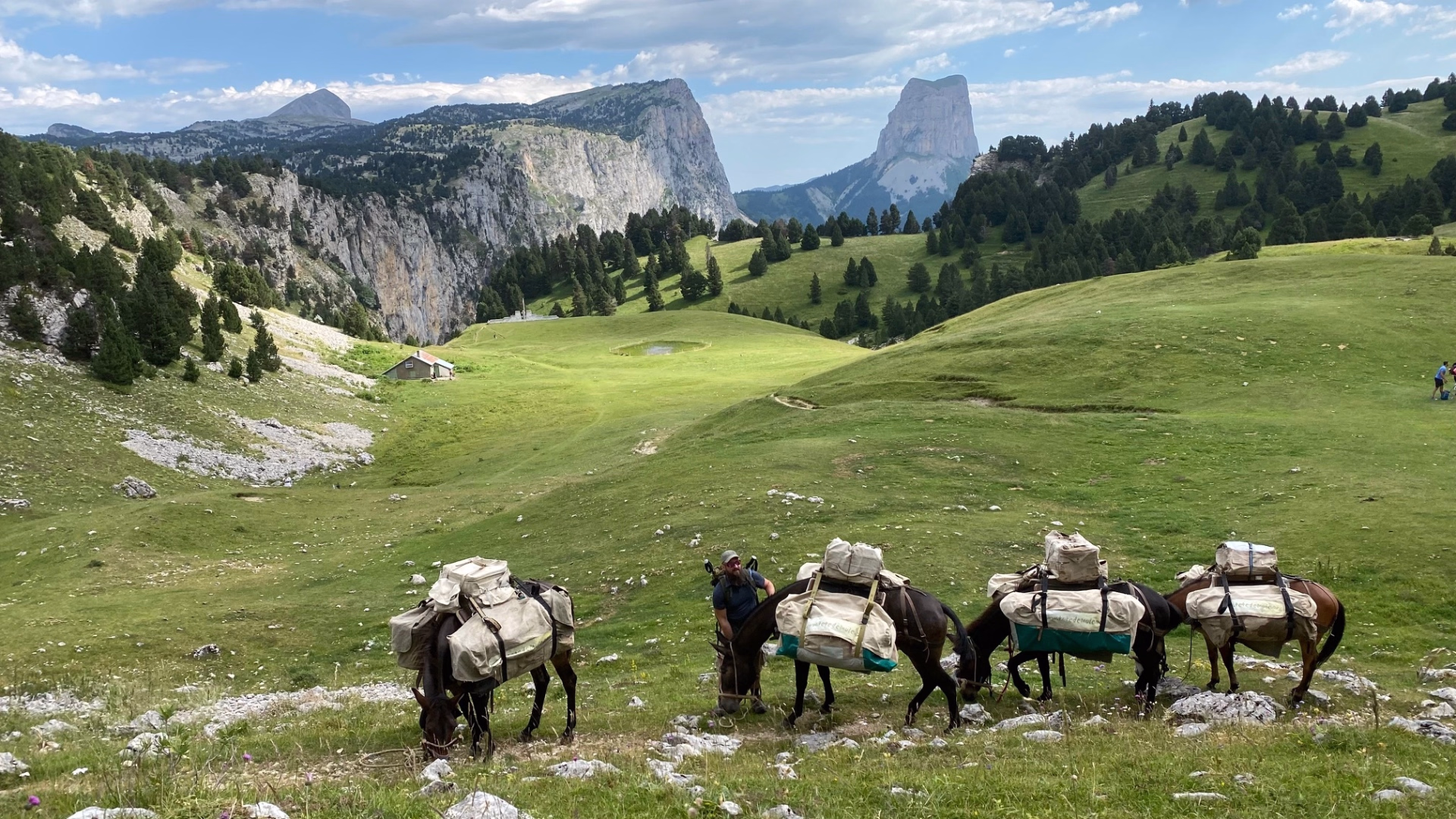 Vous partez en selle vers les crêtes de Menée, en traversant les alpages de Jiboui. La progression sur ces hauteurs offre des vues spectaculaires sur le Vercors. L’étape est technique, avec quelques passages aériens mais accessibles pour les chevaux.