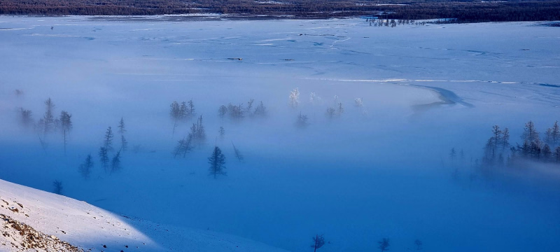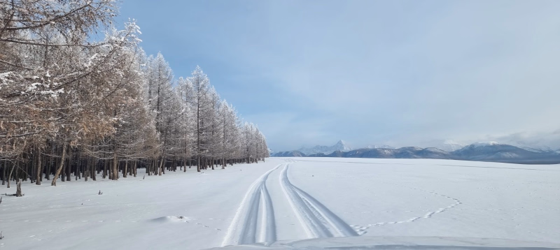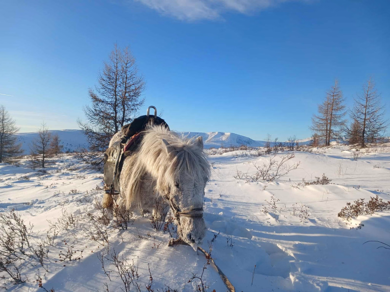 La neige crisse sous les sabots, l’air glacé transforme chaque souffle en nuage, et autour de nous, la steppe s’étire à l’infini, ponctuée de collines poudrées et d’arbres figés dans le givre. L’approche de la source se fait dans le recueillement, comme un sanctuaire invisible sous la glace, baigné de silence et de lumière blanche.