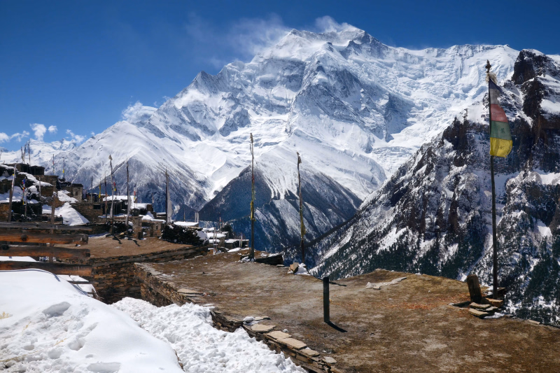 Poursuite de notre parcours face à la gigantesque barrière des Annapurnas, dont l'ensemble des sommets culminent à plus de 7000 m d'altitude : Annapurnas II, IV, III, Gangapurna, Kangsar, Tilicho Peak. Un décor exceptionnel ! Aujourd'hui, nous arpentons la haute vallée de la Marsyangdi par une variante du sentier historique, désormais recouvert par la piste carrossable qui mène à Manang. Depuis Pisang, un très beau sentier balcon permet de découvrir les vieux villages tibétains de Ghyaru et Ngawal. Arrivée à Ngawal dans l'après-midi. Nous visitons le village et son monastère.Jour 6 -