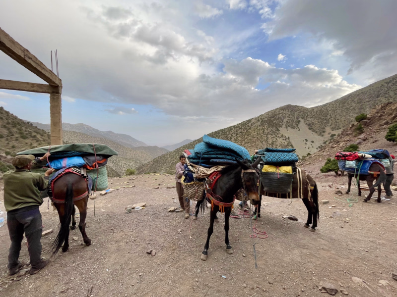 Après un transfert d'environ 2h, vous arrivez à Imi Oughlad où vous rencontrez l’équipe de muletiers qui vous accompagnera durant l'aventure. Vous commencez la randonnée à travers une forêt de chênes verts avant d’entamer l’ascension du Tizi N'Techt. Le sentier traverse plusieurs villages de montagne, accrochés aux flancs des collines. Leurs maisons en terre et en pisé se parent de la couleur rouge caractéristique de la latérite. Votre journée se termine par un bivouac sous les arbres, près de la rivière N'Ouazzaden, non loin du village de Tizi Oussem.