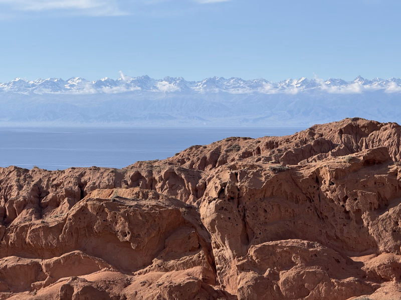 - Arrivée sur les berges du lac Issyk-Kol (1609 mètres d'altitude), le deuxième plus grand lac alpin du monde. Ce lac, une véritable mer intérieure, est la perle du Kirghizistan. Entouré de la chaîne des monts célestes, les sommets enneigées culminant à plus de 5000 mètres se reflètent dans les eaux cristallines du lac. Depuis les montagnes environnantes, des dizaines de rivières affluent vers le lac via de nombreuses vallées rivalisant de beauté.