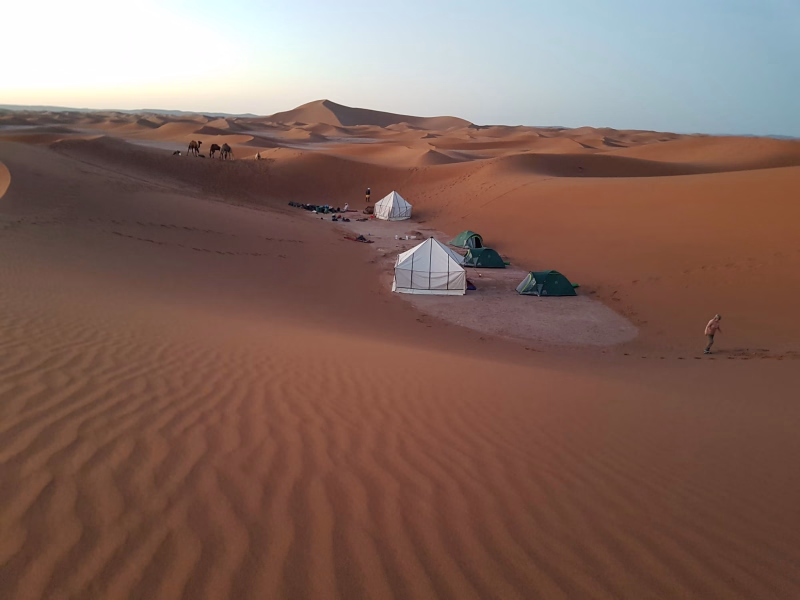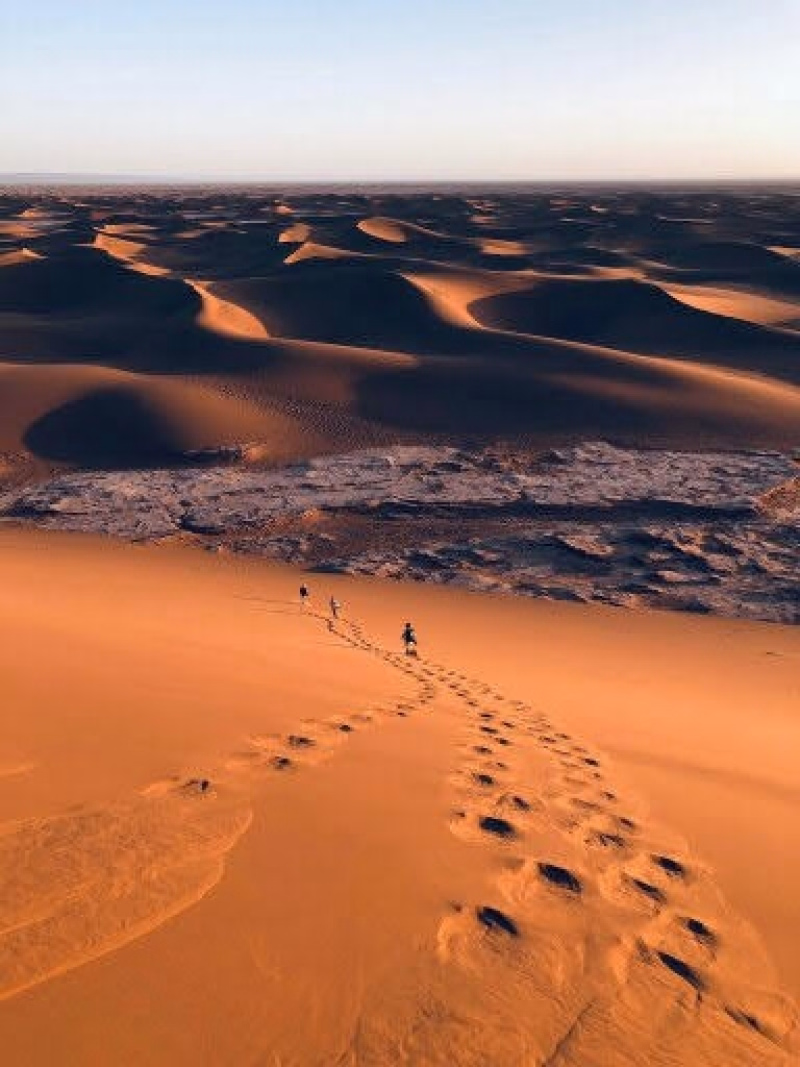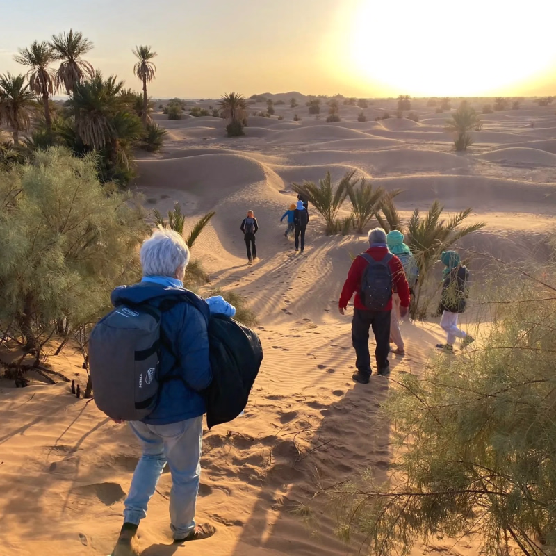 La marche, sans difficulté technique, invite à une déconnexion profonde et procure un sentiment durable de paix intérieure. Depuis la palmeraie de M’hamid El Ghizlane, surnommée la plaine des gazelles, l’itinéraire s’ouvre progressivement sur l’immensité du désert, révélant un royaume de sable aux couleurs changeantes.