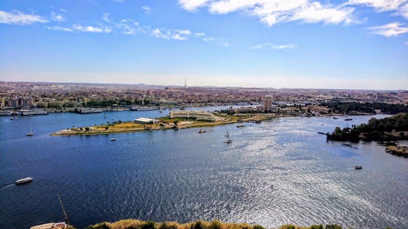 Le panorama sur Assouan, l’île Éléphantine et le Nil est spectaculaire.