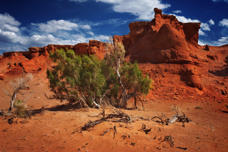 Découverte des falaises de Bayanzag, surnommées les « falaises enflammées » en raison de leurs teintes ocre et rouge qui s’illuminent à la lumière du soleil. Ces formations spectaculaires abritent le célèbre « cimetière des dragons », un site paléontologique majeur entouré de forêts de saxaouls caractéristiques du désert de Gobi.