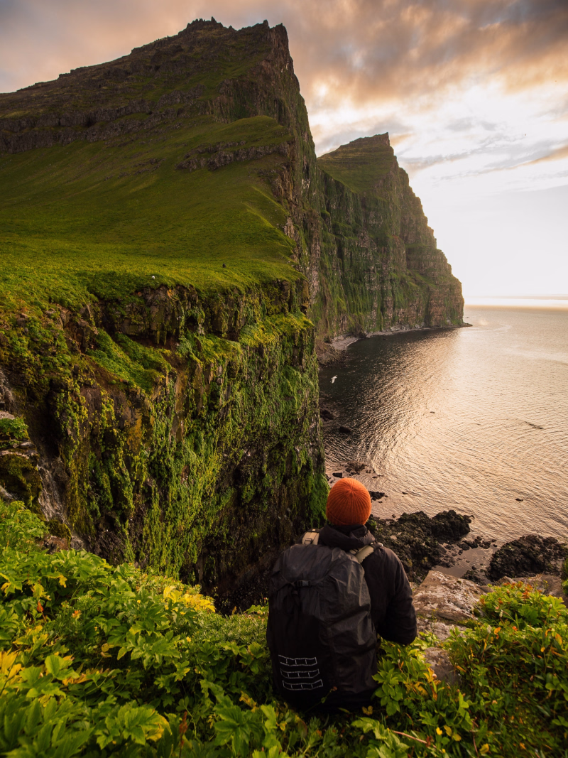 Depuis le sommet du col, vous découvrirez l'intégralité de la baie de Hornvík, encadrée par les pics acérés qui bordent les falaises — un spectacle à couper le souffle. Nous redescendrons ensuite vers notre camp de base, où un repas fait maison bien mérité nous attendra.
