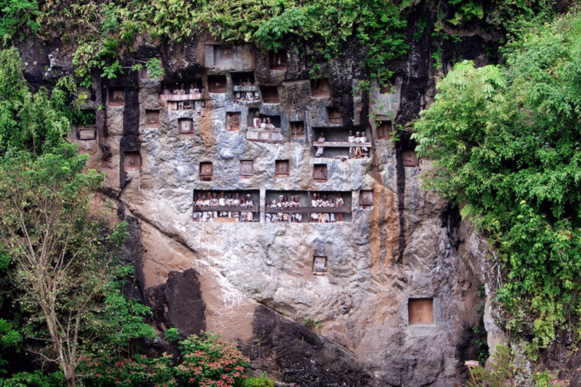 Journée complète d’exploration du Pays Toraja (au sud de Rantepao). Les Torajas vivent dans des maisons « tongkonan » dont la forme fait penser à une coque de bateau. Ils vouent un culte au buffle d’eau qui selon eux est le seul animal capable de transporter l’âme des défunts sur le chemin de leurs ancêtres. Les Torajas sont également connus pour l’importance de leurs cérémonies funéraires qui durent plusieurs jours, et leurs systèmes de tombes suspendues installées dans les falaises. Au cours de la journée, vous découvrez plusieurs sites : la falaise de Londa, avec ses niches mortuaires, située au milieu des rizières et des girofliers, le village de Kete Kesu avec ses maisons traditionnelles, ses greniers à riz et le rocher habité d’âmes de Suaya avec ses tombes royales. Après le déjeuner, vous découvrez les tombes des nouveau-nés à Sanggala puis vous vous arrêtez dans une plantation d’épices avant d’arriver à Lemo, un de plus beaux villages Toraja, bordé d’une falaise percée d’innombrables sépultures et de niches à Tau-Tau (poupées à l’effigie des défunts). Retour à l’hôtel en fin d’après-midi.