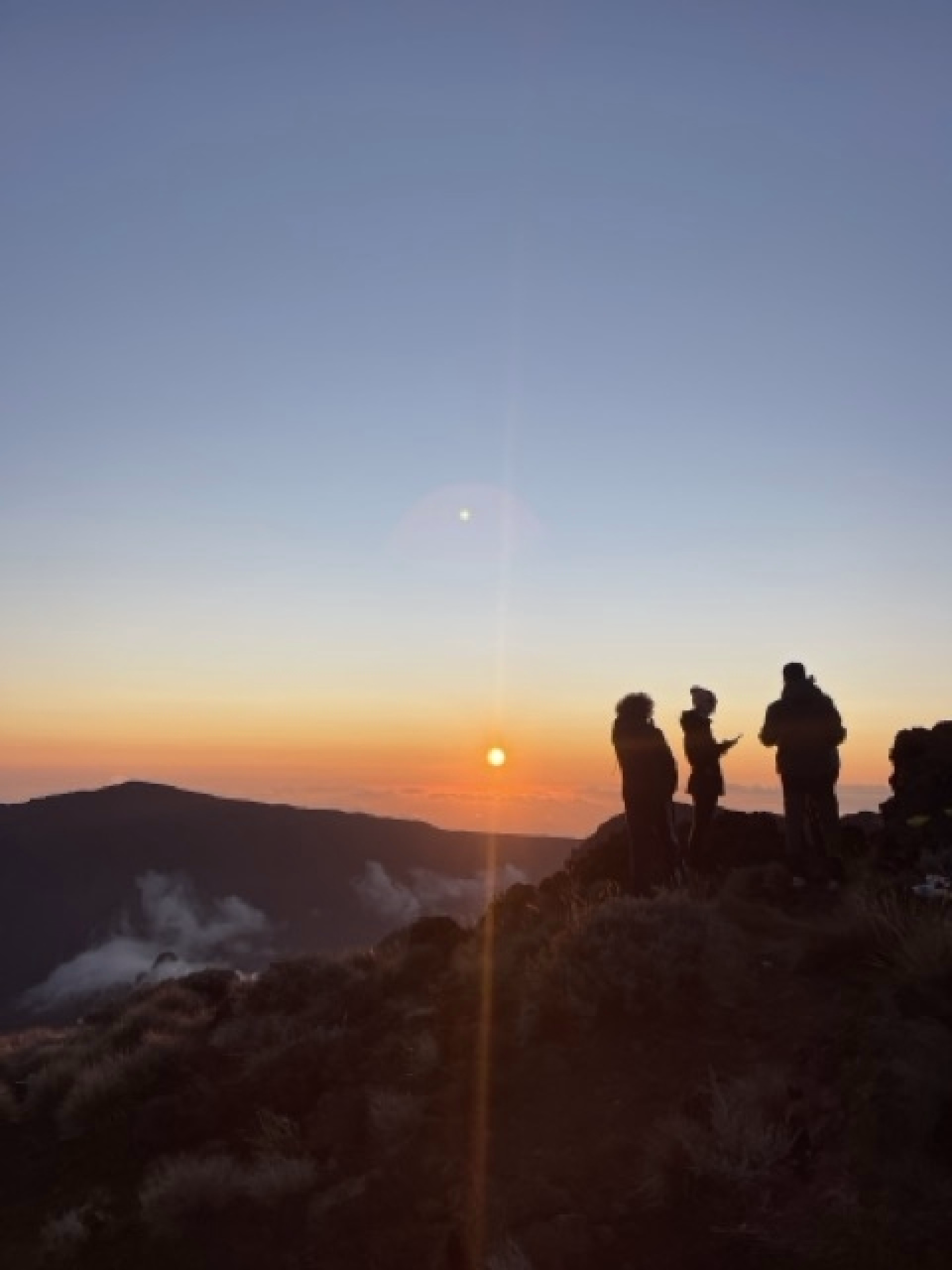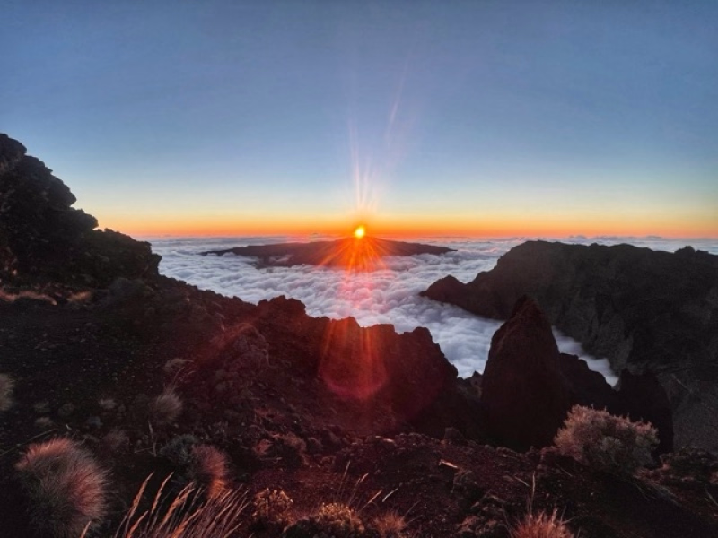 Réveil magique au sommet du Piton des Neiges, nous profiterons d'un magnifique lever de soleil pour le petit déjeuner avant d’entamer une longue descente technique vers Cilaos au parking du bloc. Une fois arrivés en bas, un transfert en navette nous mènera à notre prochain défi : le massif du Piton de la Fournaise.