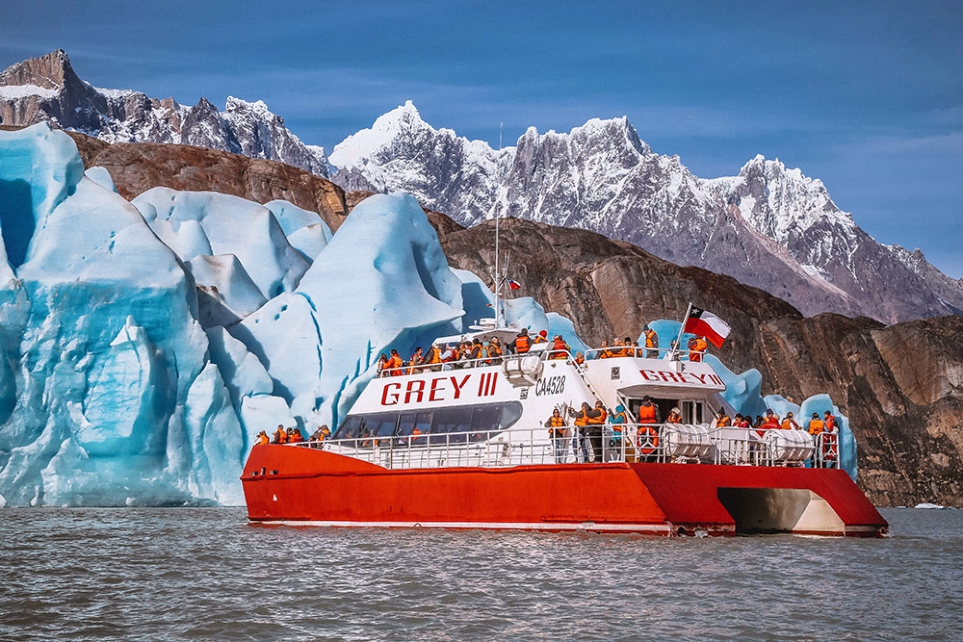 Départ depuis la plage du Lac Grey en direction du majestueux glacier du même nom. Durant les 45 premières minutes, nous naviguerons en longeant l'imposant Massif Paine jusqu'au Refuge Grey, où nous ferons un arrêt de 15 minutes pour l'échange de passagers effectuant le circuit W sur les sentiers internes du Parc National Torres del Paine.