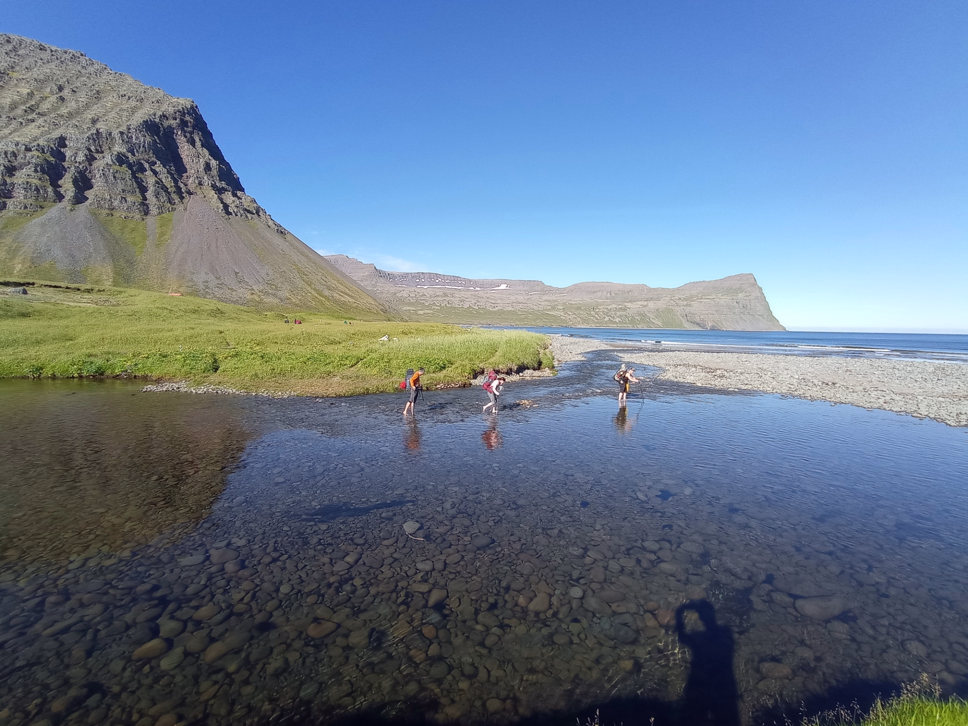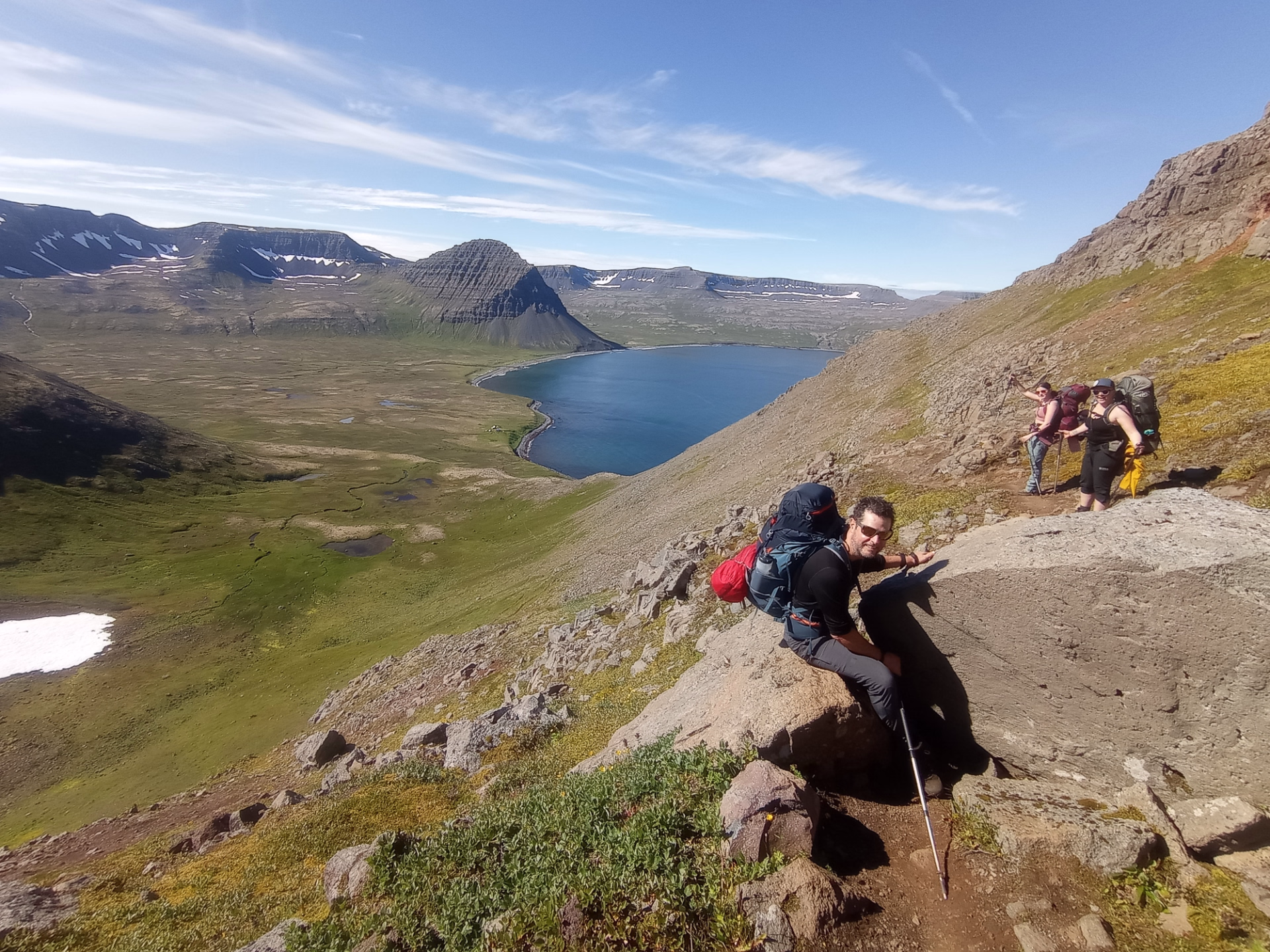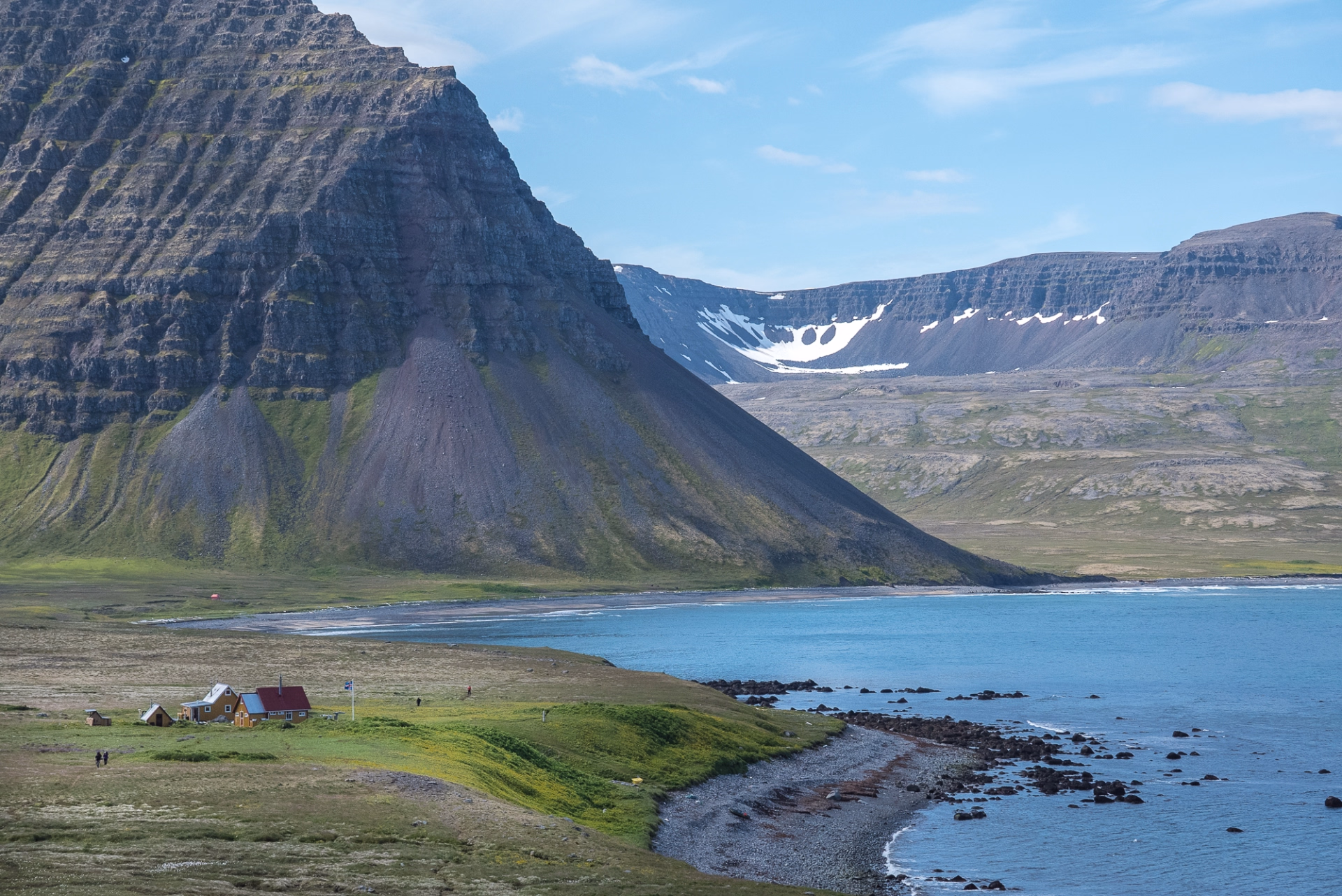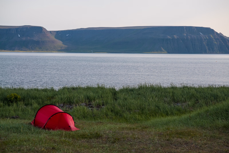 Après un petit-déjeuner copieux, nous levons le camp à Látrar. Le sentier traverse les plaines en longeant l'ancienne piste d'atterrissage américaine datant de la guerre froide, avant d'entamer l'ascension des versants vers le nord-est. Plus nous montons, plus la vue sur les fjords et les criques devient saisissante, avec des montagnes escarpées à perte de vue. Après quelques heures de traversée sur le plateau, nous commençons la descente vers l'ancienne ferme de Tunga. La dernière partie de la randonnée du jour nous mène le long des rives du lac Fljótavatn, réputé pour l'excellente pêche à l'omble chevalier, pour établir notre campement près de l'ancienne ferme de Glúmsstaðir.