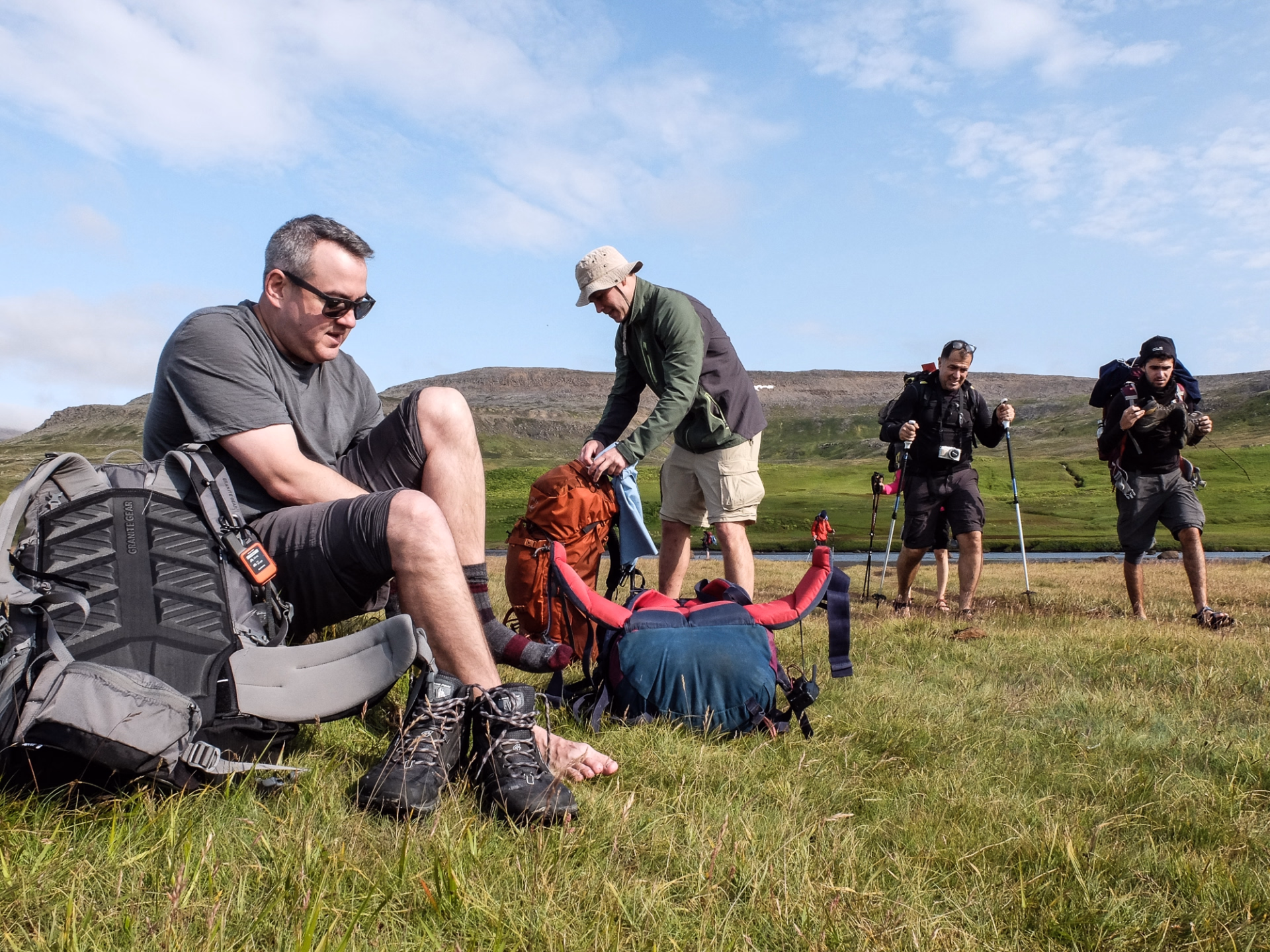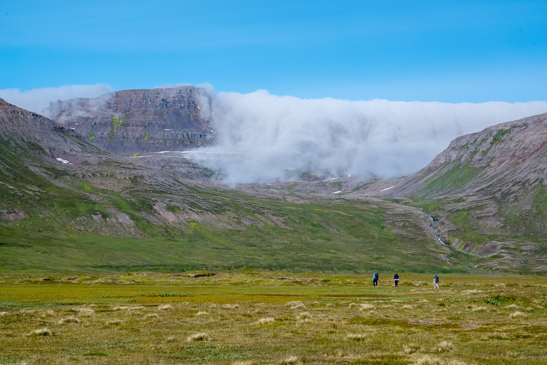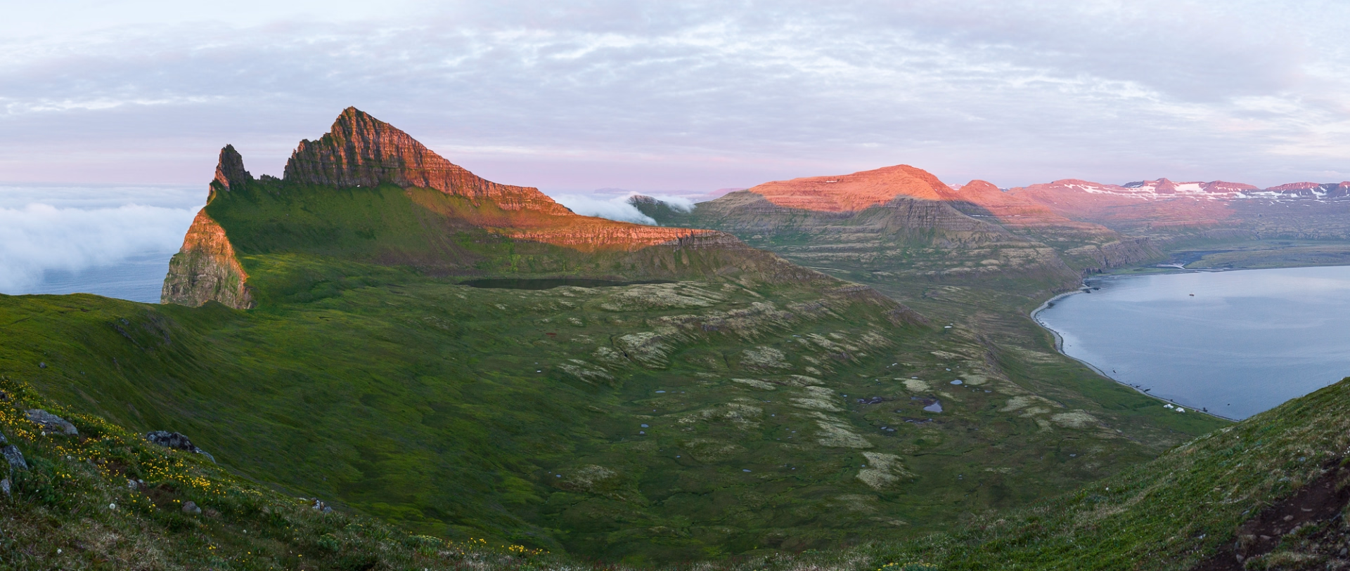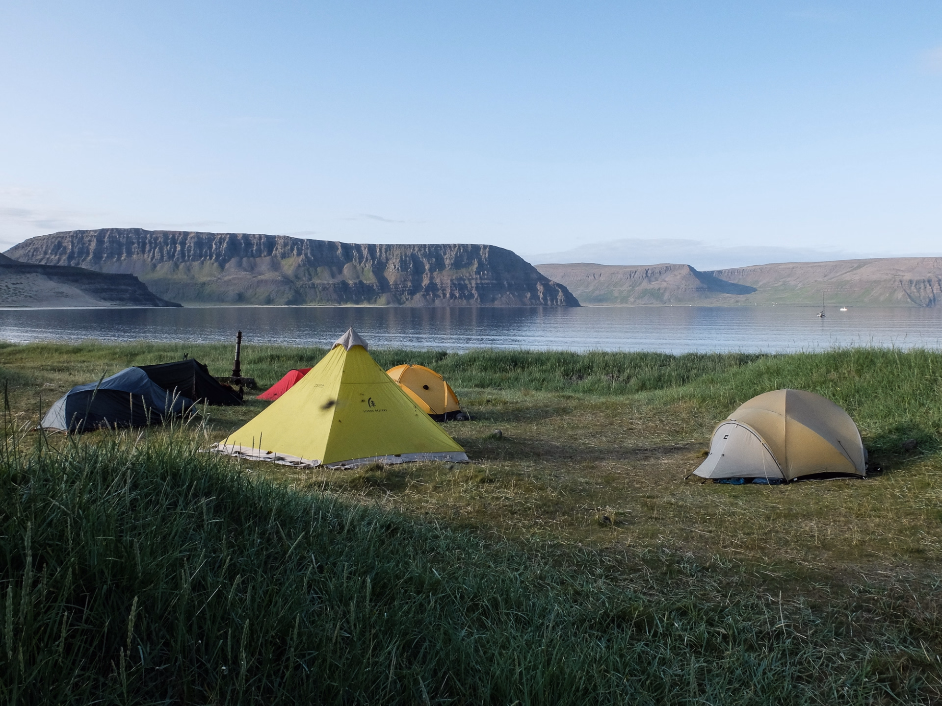 Après un petit-déjeuner copieux, nous levons le camp à Látrar. Le sentier traverse les plaines en longeant l'ancienne piste d'atterrissage américaine datant de la guerre froide, avant d'entamer l'ascension des versants vers le nord-est. Plus nous montons, plus la vue sur les fjords et les criques devient saisissante, avec des montagnes escarpées à perte de vue. Après quelques heures de traversée sur le plateau, nous commençons la descente vers l'ancienne ferme de Tunga. La dernière partie de la randonnée du jour nous mène le long des rives du lac Fljótavatn, réputé pour l'excellente pêche à l'omble chevalier, pour établir notre campement près de l'ancienne ferme de Glúmsstaðir.