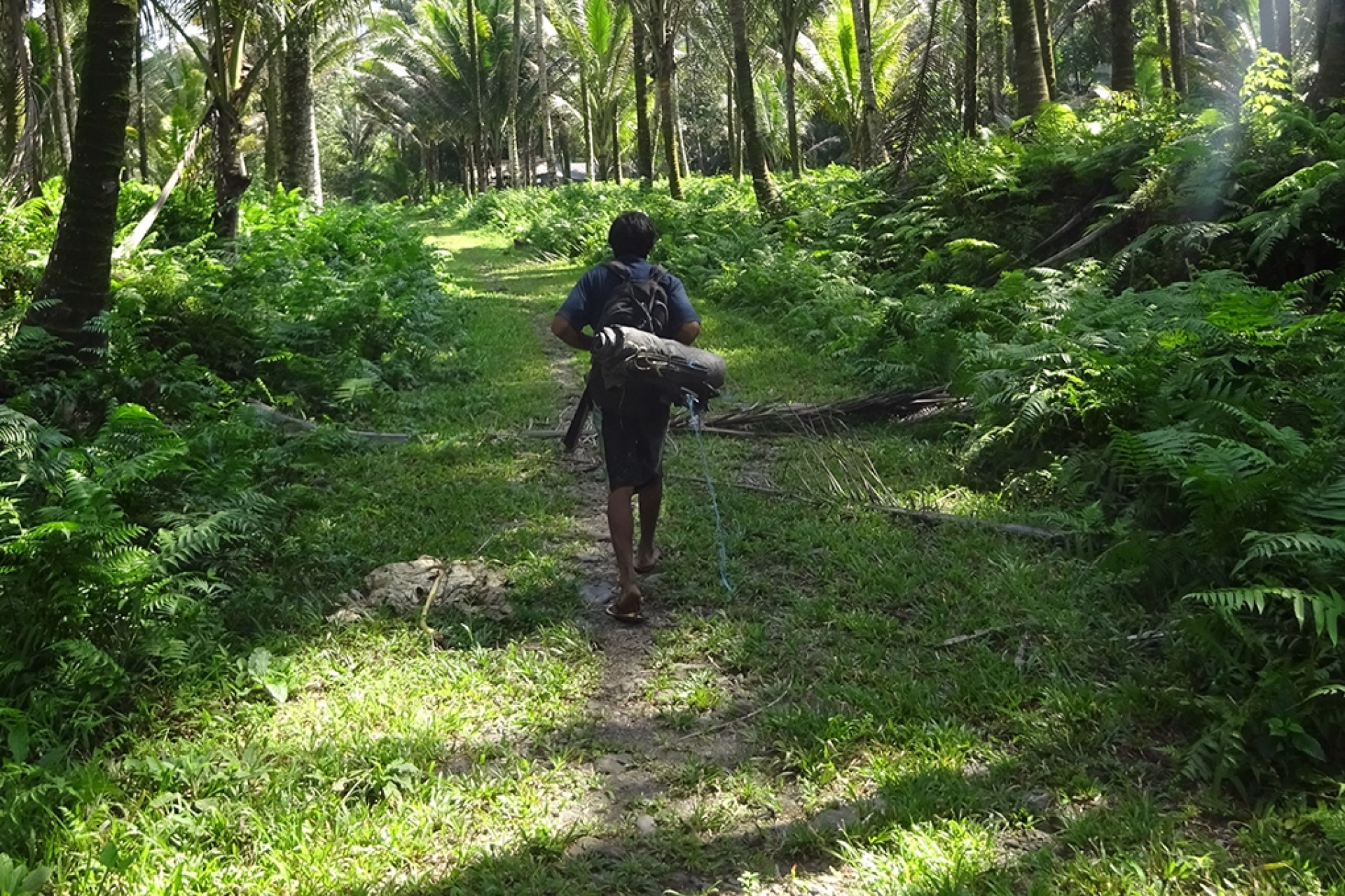 Transfert matinal en speed-boat vers le port de Jailolo, sur l’île d’Halmahera, puis route vers le pied du volcan Ibu. Vous entamez ensuite la randonnée d’approche vers le sommet. Le sentier débute par plusieurs kilomètres de marche relativement plate à travers de vastes plantations de cocotiers ponctuées de petits abris en bois. Il est souvent possible de parcourir environ deux kilomètres en moto jusqu’à une altitude d’un peu plus de 200 mètres. Le chemin se poursuit à travers les plantations de noix de muscade et de clous de girofle avant de pénétrer dans la forêt vers 600 mètres d’altitude. Après 2 à 3 heures de marche, vous atteignez Pos 1 (675 m), un abri agréable autrefois utilisé par les chasseurs de cochons pour préparer la viande avant de redescendre au village. Le sentier descend ensuite dans un ravin (655 m) de sable noir et de rochers, parfois traversé par une source d’eau. Selon l’activité et le vent, on peut déjà y entendre les grondements et chutes de pierres du volcan — un bruit saisissant, surtout la nuit. Le chemin suit le ravin sur quelques centaines de mètres avant de remonter et de s’enfoncer à nouveau dans la forêt (673 m). Après quelques zones herbeuses, vous atteignez Pos 2 (780 m), près de la station de capteurs volcanologiques (env. 800 m). C’est ici que vous installerez votre bivouac pour la nuit.