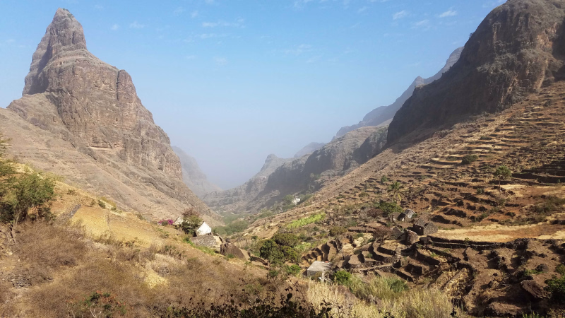 Cette randonnée qui nous emmène dans des paysages grandioses à la découverte de la vallée de Paul est un véritable enchantement. Nous passons le long de terrasses cultivées avant d'aller manger chez Sandra, d'où nous jouissons d'une vue imprenable sur l'océan au loin. Nous découvrons un monde ingénieux, montagnard et rural, de terrasses et leurs canalisations façonnées par l'homme. Nous marchons jusqu'à Boca de Figueiras, où nous allons à la rencontre des habitants et découvrons la vie rurale cap-verdienne. En fin d'après-midi, nous nous installons dans une petite pension familiale à Vila das Pombas, en bordure d'océan, au cœur d'un village du bout du monde bercé par le bruit des vagues.