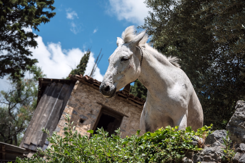Après avoir dépassé la source de Gavros, vous entrez dans le village de Magouliana, niché en altitude. En traversant ses ruelles étroites, vous atteignez un col à l’ouest, jalonné d’aires de battage en pierre et offrant de larges panoramas. Une descente progressive mène ensuite au sanatorium historique de Mana, via de petits sentiers et routes rurales.
