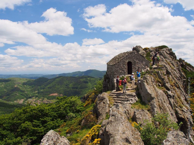 Un transfert en bus vous permet de rejoindre le village de Borée, en Ardèche, au cœur d’un ensemble de volcans exceptionnels. Au milieu des vallées des Boutières, quelques-uns d’entre eux dominent, comme le Suc de Sara, le Gouleyou ou le rocher de Soutron. Au sommet de ce dernier, se trouve une petite chapelle, dédiée à Saint-Julien. C’est un curieux abri en cas de mauvais temps, c’est un point de vue magnifique en cas de beau temps. On peut même y voir toute la chaine des Alpes, dont les premiers sommets se situent à moins de 100 kilomètres à vol d’oiseau. Le secteur parait plus forestier que la veille, votre guide vous explique pourquoi.
