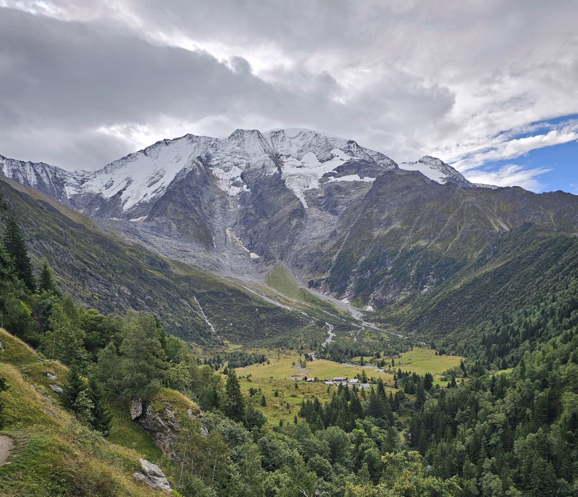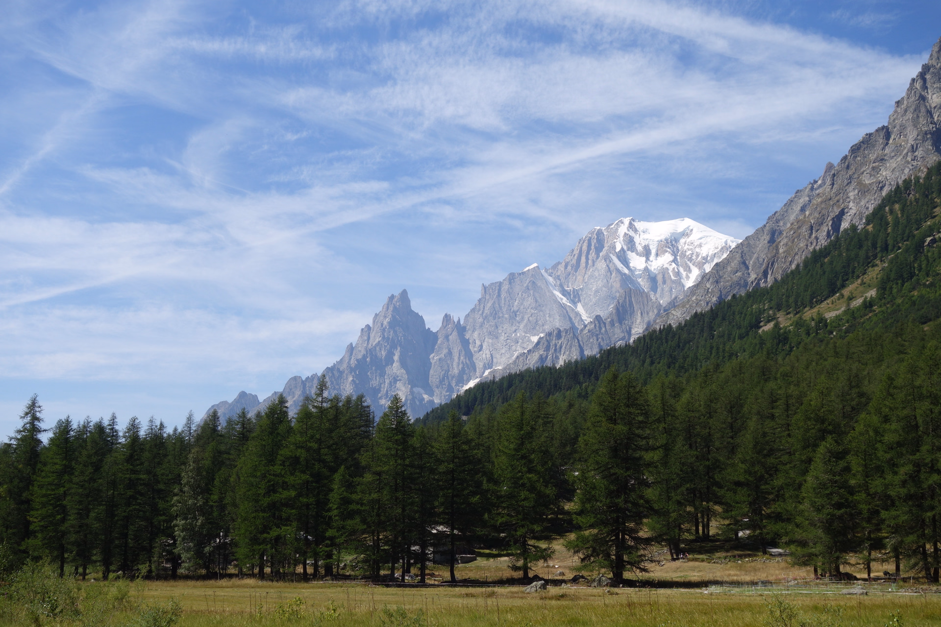 Nous descendons sur Courmayeur pour une courte visite. La chaude montée parmi les mélèzes clairsemés voit sa récompense au Pré de la Saxe (2000 m), splendide belvédère sur la Dent du Géant et les Grandes Jorasses. La sieste y est de mise.