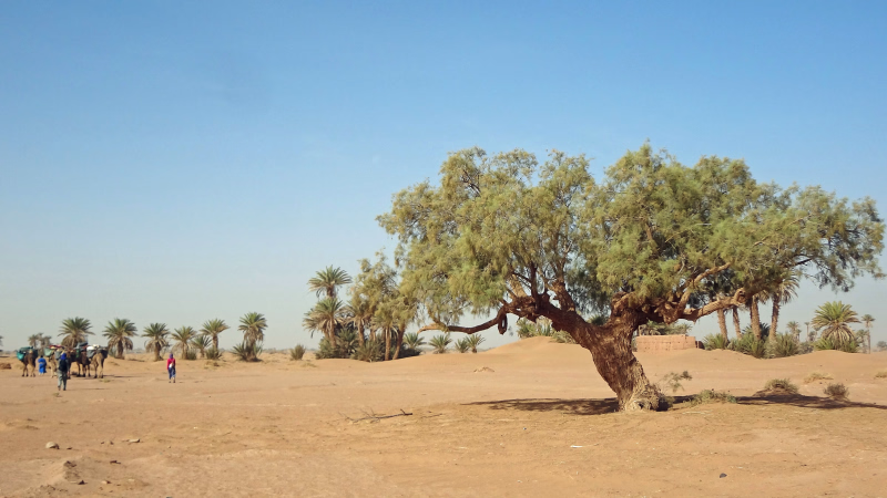 Votre trek et randonnée désert maroc commence dès le premier jour ! Après le petit-déjeuner à M’Hamid, la porte du désert, vous vous dirigerez vers le tombeau de Sidi Naji, ancien marabout vénéré par les nomades.