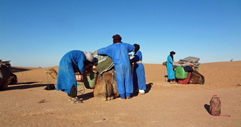 Ayant passé leur vie aux côtés des dromadaires et parcouru les anciennes routes caravanières, ils possèdent un savoir précieux transmis de génération en génération. Ces chemins historiques étaient autrefois empruntés par leurs ancêtres, qui guidaient des caravanes de Marrakech jusqu’à Tombouctou, transportant des marchandises précieuses telles que le sel, l’or et l’ivoire à travers le Sahara.