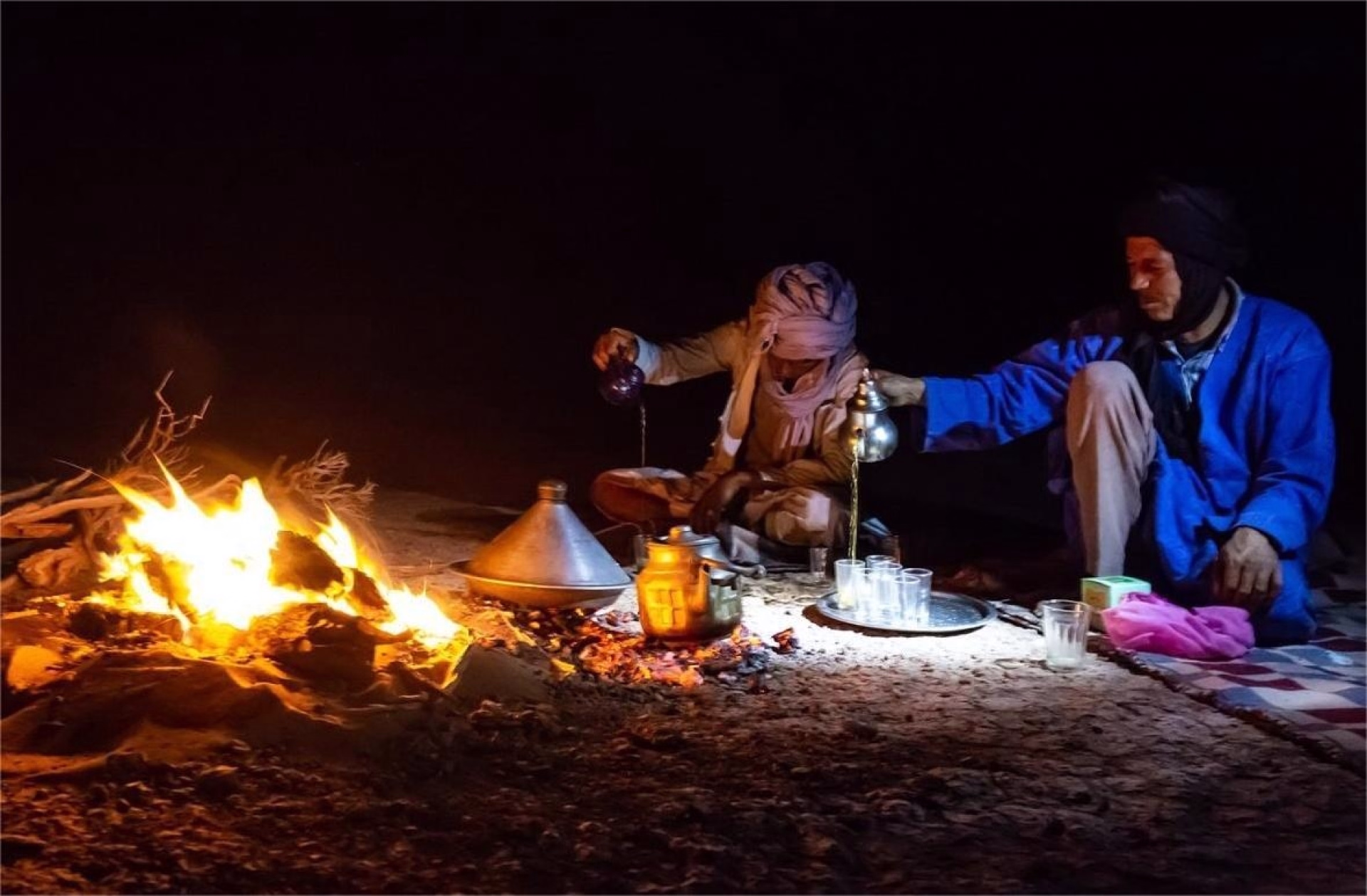 À la tombée de la nuit, retour au camp pour savourer un dîner traditionnel marocain, préparé sur place et servi sous un ciel étoilé d’une pureté exceptionnelle. La soirée se prolonge au rythme de la musique berbère, autour du feu, dans une ambiance chaleureuse et conviviale.