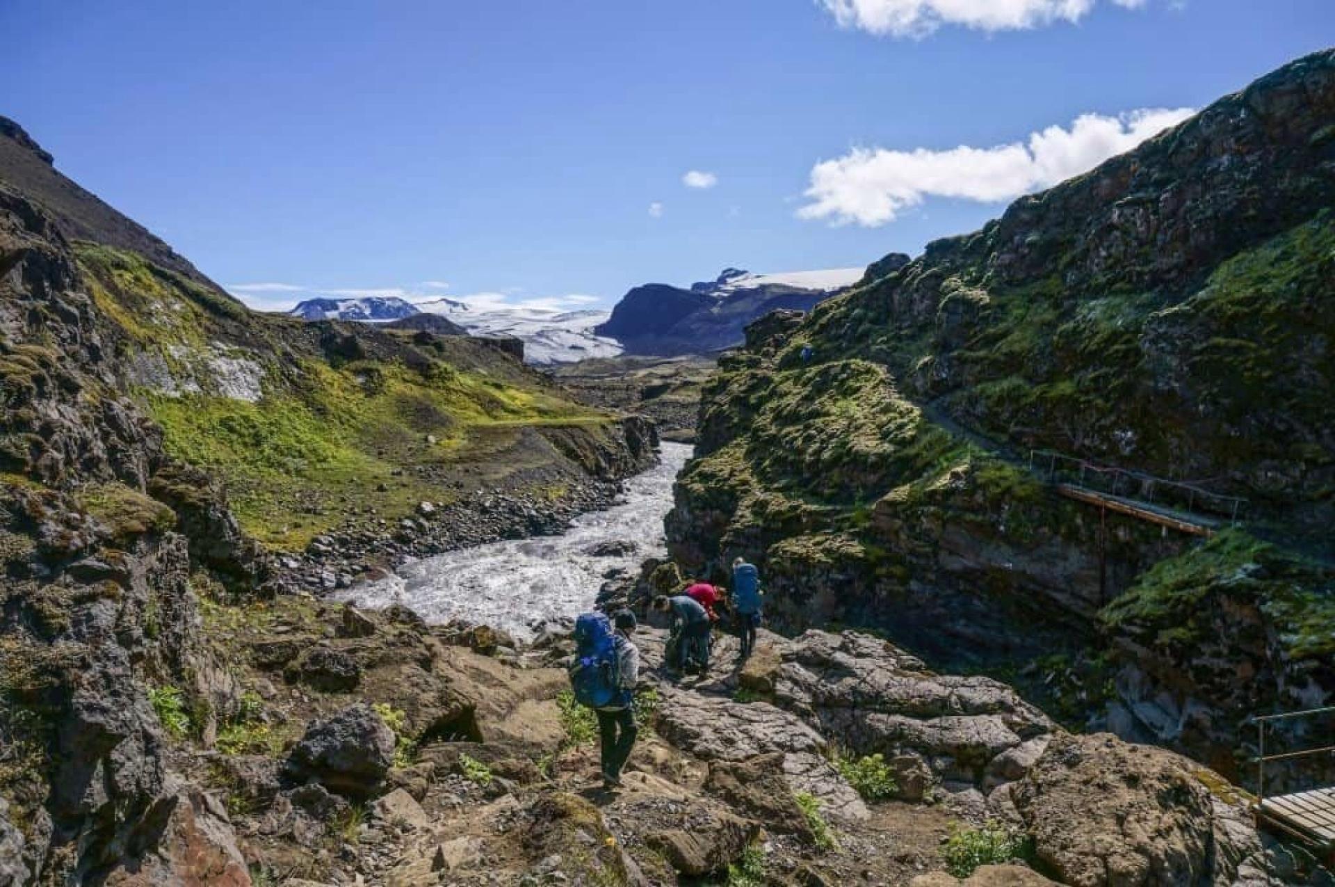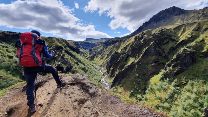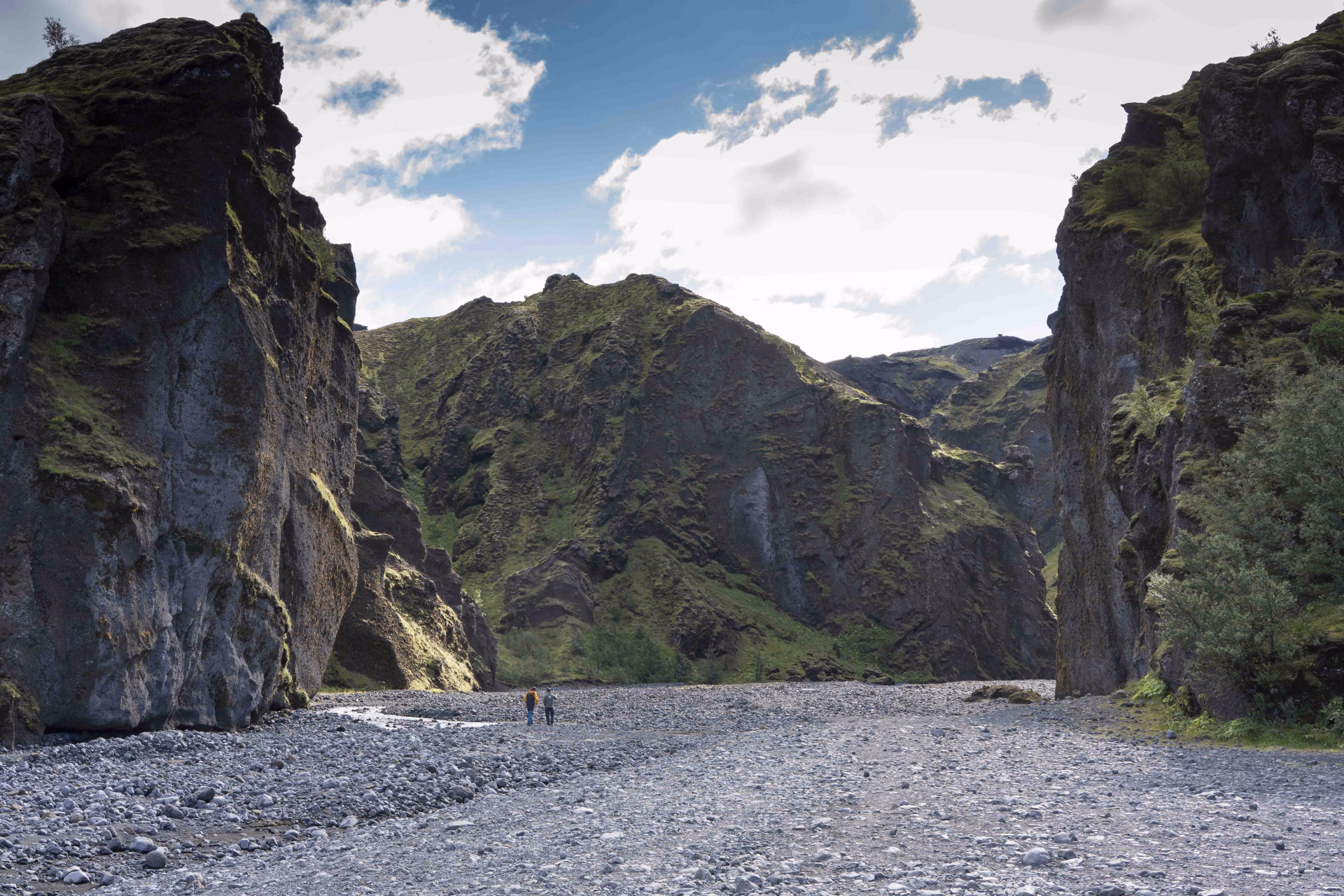 En approchant d’Emstrur, le sentier longe les gorges de la rivière Markarfljót : un canyon impressionnant avec des panoramas sur les montagnes, les vallées et les rivières glaciaires en contrebas.