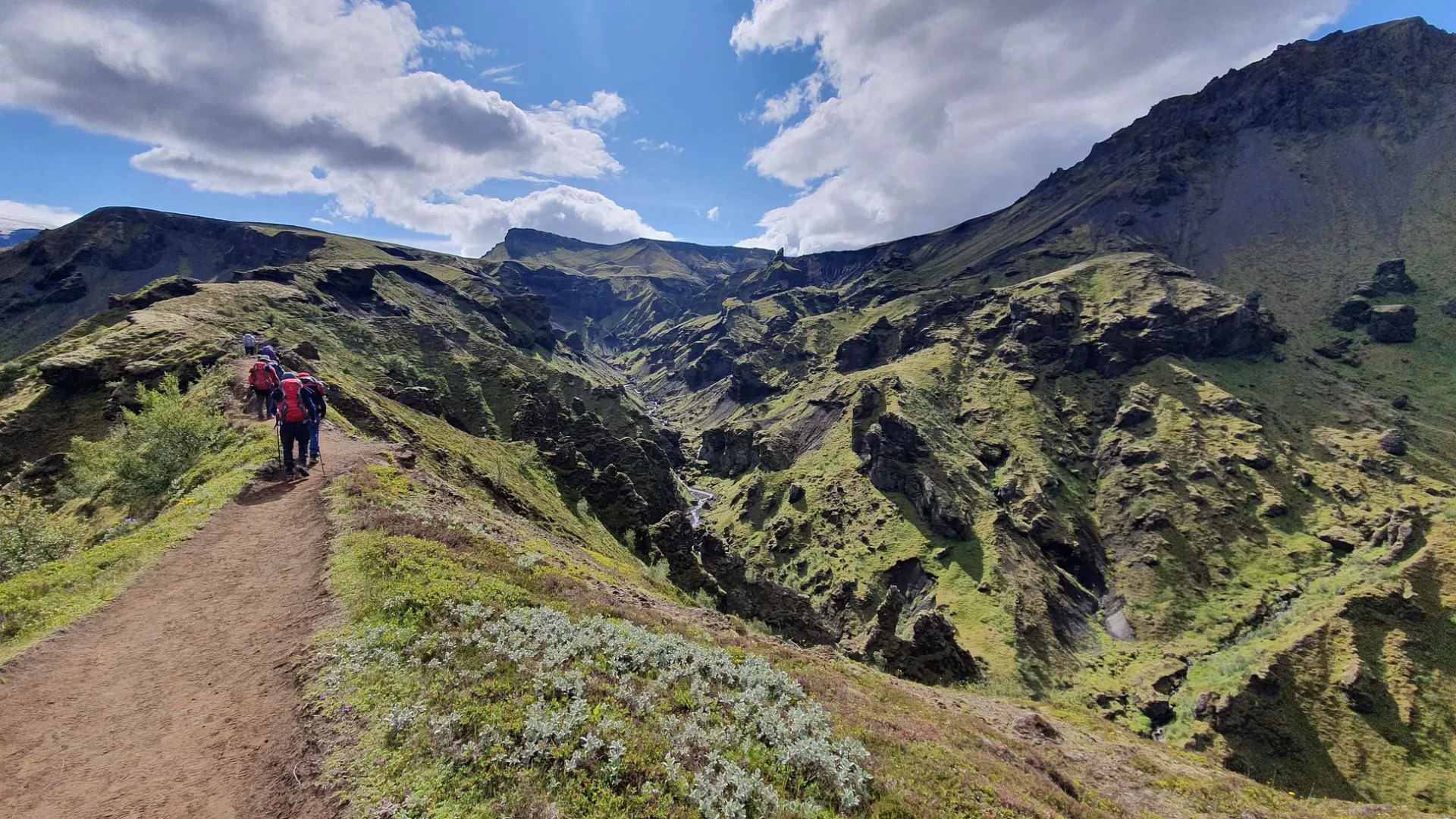 Puis, la vue s’ouvre progressivement sur la spectaculaire vallée de Þórsmörk : montagnes abruptes, rivières tressées, glaciers au loin… Une arrivée grandiose pour célébrer la fin du trek 🎉