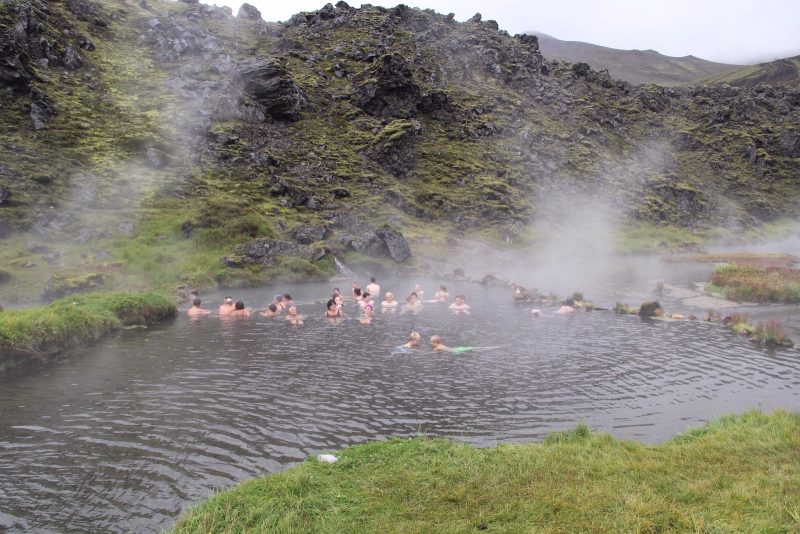 C’est l’étape la plus longue du trek : mieux vaut partir tôt pour en profiter sans se presser. Le sentier traverse d’abord le champ de lave de Laugahraun, puis grimpe vers la zone géothermique de Stórihver avec ses vues dégagées sur les glaciers voisins.