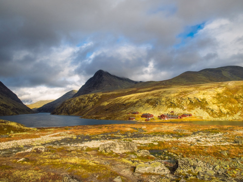 Après le petit déjeuner et la préparation du matpakke, vous entamez l’étape reliant Bjørnhollia à Øvre Dørålseter. Le décor devient plus alpin et minéral. La montée progressive dans la vallée de Dørålen révèle des sommets rocheux imposants et une ambiance de haute montagne très marquée. L’étape est longue, environ 21 km pour un dénivelé + d'environ 675 m. Le dénivelé est donc plus soutenu que les jours précédents, mais reste régulier et sans passages exposés. Le terrain est toutefois caillouteux, nécessitant une bonne concentration et un sens de l'équilibre bien assuré. Cette journée est souvent considérée comme l’une des plus spectaculaires du trek, tant par la grandeur des paysages que par la sensation d’isolement. Arrivée en fin d’après-midi à Øvre Dørålseter, installation, dîner sur place et nuit en dortoir de deux lits, dans une ambiance montagnarde authentique.