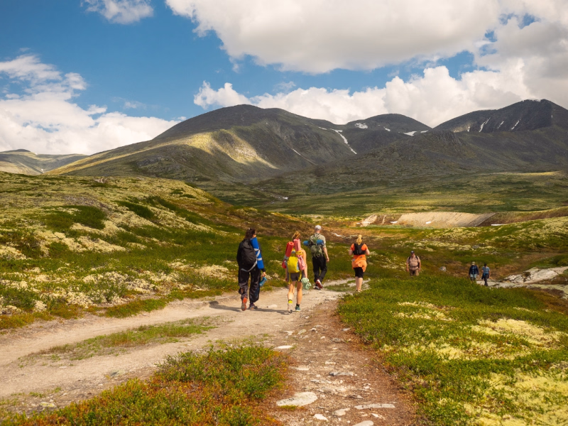 La journée débute par le petit déjeuner et la préparation du matpakke avant de prendre le chemin vers Hjerkinn Fjellstue. Cette dernière étape de randonnée est plus douce, avec une descente progressive vers les hauts plateaux du Dovrefjell. Les paysages s’ouvrent largement, offrant de vastes panoramas et une ambiance très lumineuse par beau temps. La marche dure environ 6 heures pour une distance proche de 17,5 km. La difficulté est modérée, idéale pour conclure le trek sans pression. En fin d’après-midi, arrivée à Hjerkinn Fjellstue, où le confort de l’hôtel contraste agréablement avec les nuits en refuge. Dîner sur place et nuit à l’hôtel, dans une atmosphère paisible, marquant la fin de la traversée pédestre.